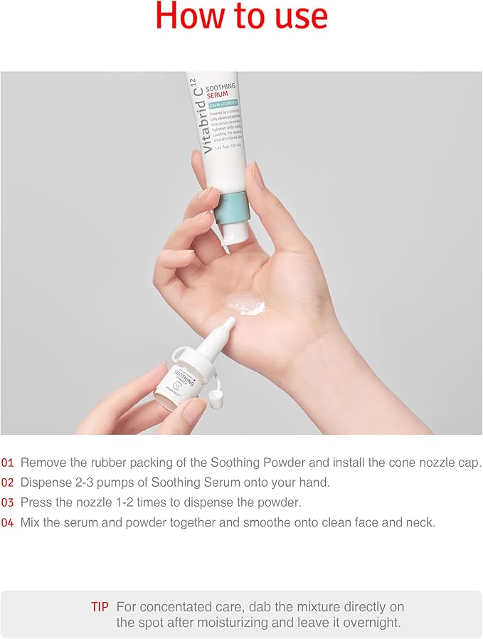 - EASY AND EFFECTIVE APPLICATION: Remove the rubber packing and attach the cone nozzle cap. Dispense 2-3 pumps of Soothing Serum into your hand, press the nozzle to add powder, mix, and apply evenly to the face and neck for comprehensive coverage and effective treatment.