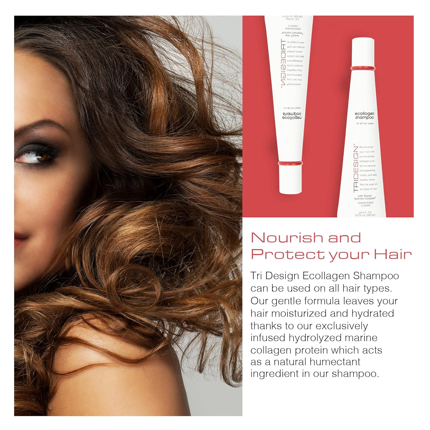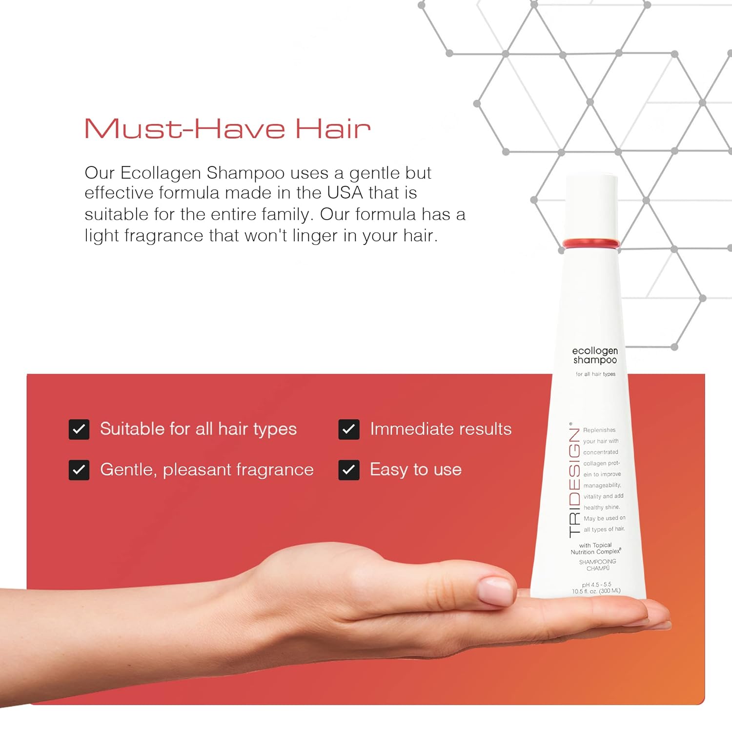 - GENTLE BUT EFFECTIVE: Ecollogen shampoo is perfect for you and your family! This mild shampoo is blended with effective ingredients for damaged hair. It helps moisturize your hair and adds a healthy shine. Tridesign replenishes your hair with concentrated collagen protein, which may improve manageability for all hair types. Give your hair the treatment and care it deserves with our must-have shampoo!