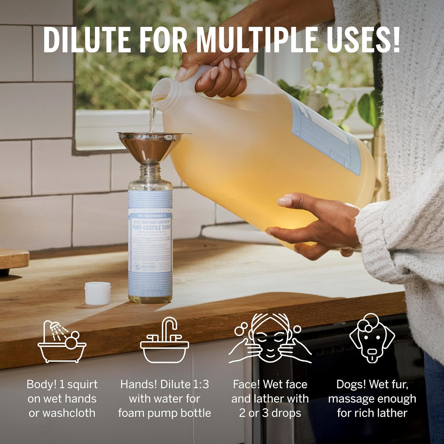 Dr. Bronner's Pure-Castile Magic Soap Liquid (Baby Unscented, 1 Gallon) – Made with Regenerative Organic Certified Oils- For Sensitive Skin, Babies, Face, Hair, Laundry, Dishes, Hand Soap & Body Wash