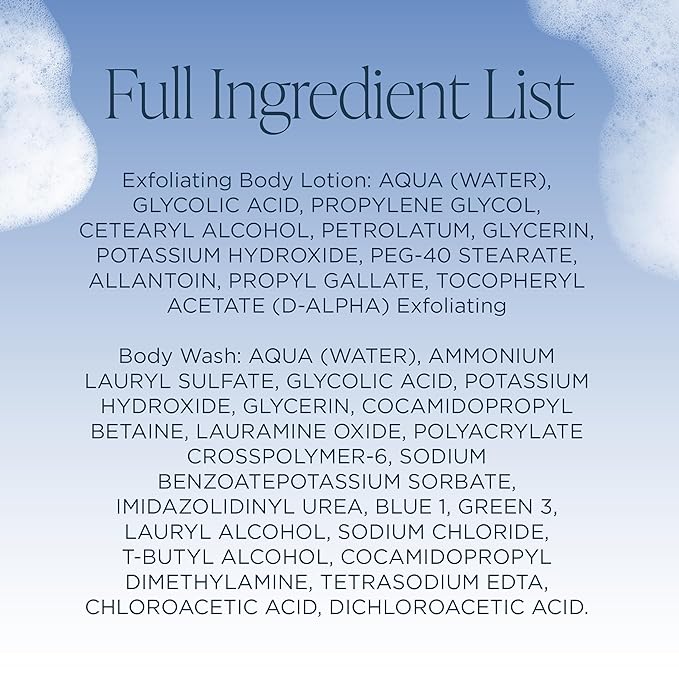 - GLYCOLIC ACID FORMULA FOR ROUGH SKIN: Both the body wash and lotion are powered by glycolic acid to gently exfoliate and reduce the look of chicken skin, clogged pores, and uneven tone. Helps retexturize dry, flaky areas without irritation.