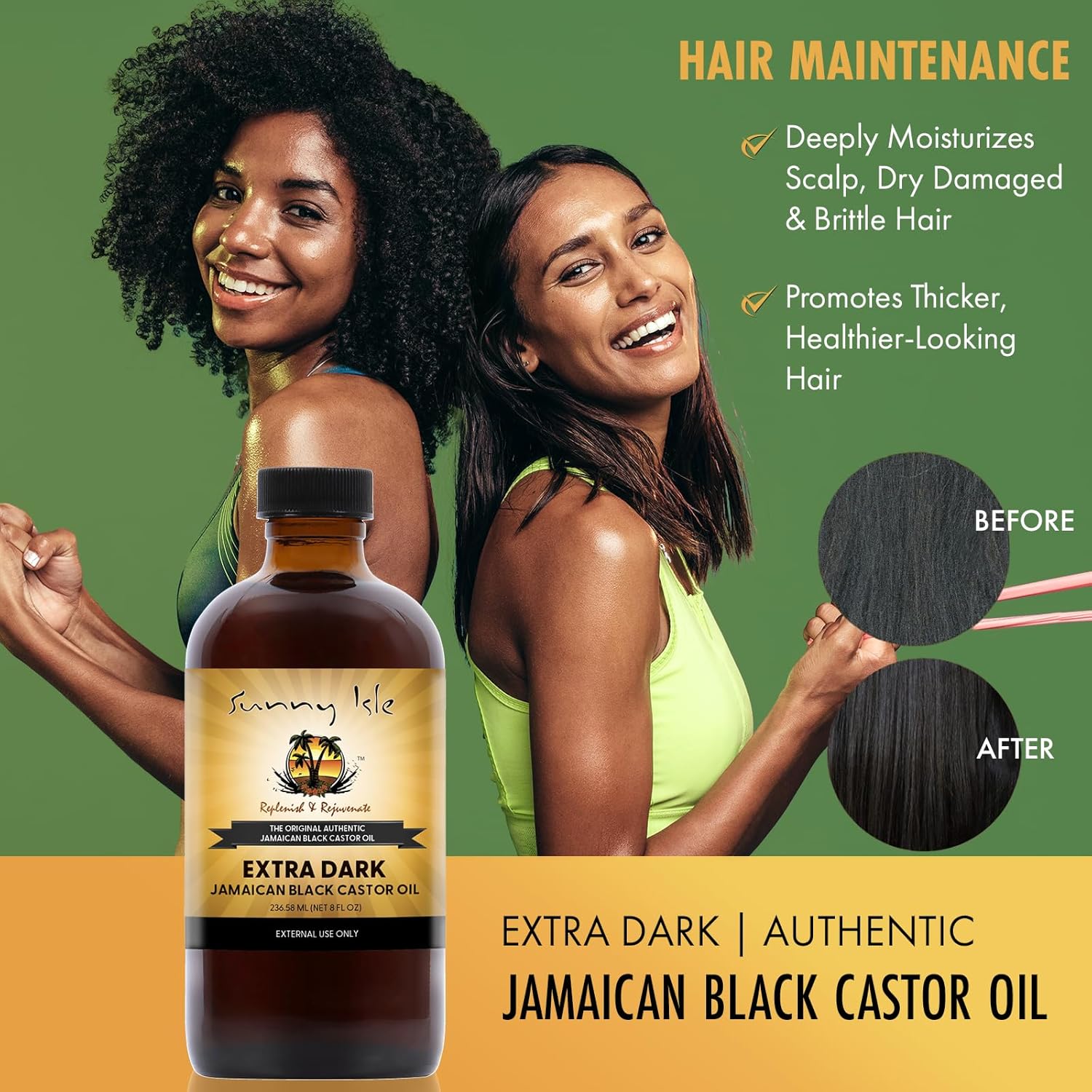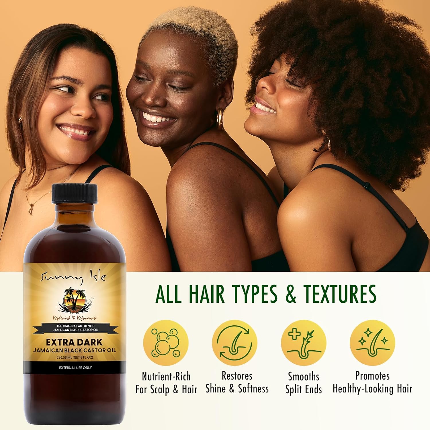 - RICHER, THICKER, MORE POTENT: Our Extra Dark JBCO formula has a thicker, richer consistency and the highest ash content, ideal for nourishing the hair follicle & scalp and treating extremely dry, damaged hair. Sunny Isle's organic castor seeds are roasted and ground by a manual grinder and then boiled to extract the 100% pure, dark brown oil.
