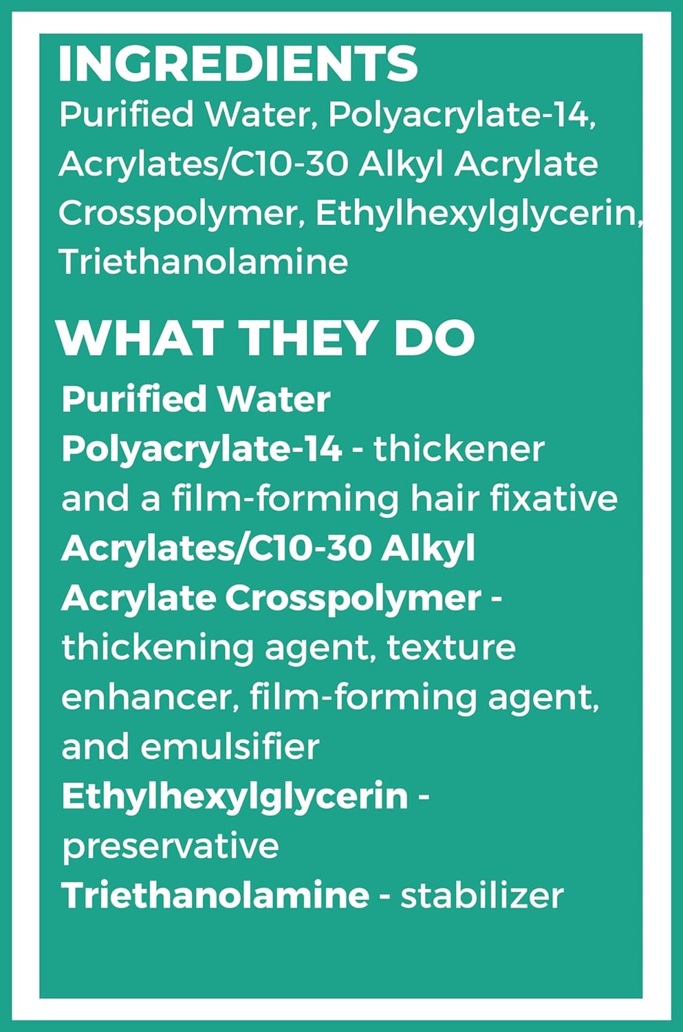 - Hydrates, Conditions & Styles - One of the key ingredients in our gel is Polyacrylate-14 that helps control frizz, helps define long lasting curls and maintain your style with medium hold