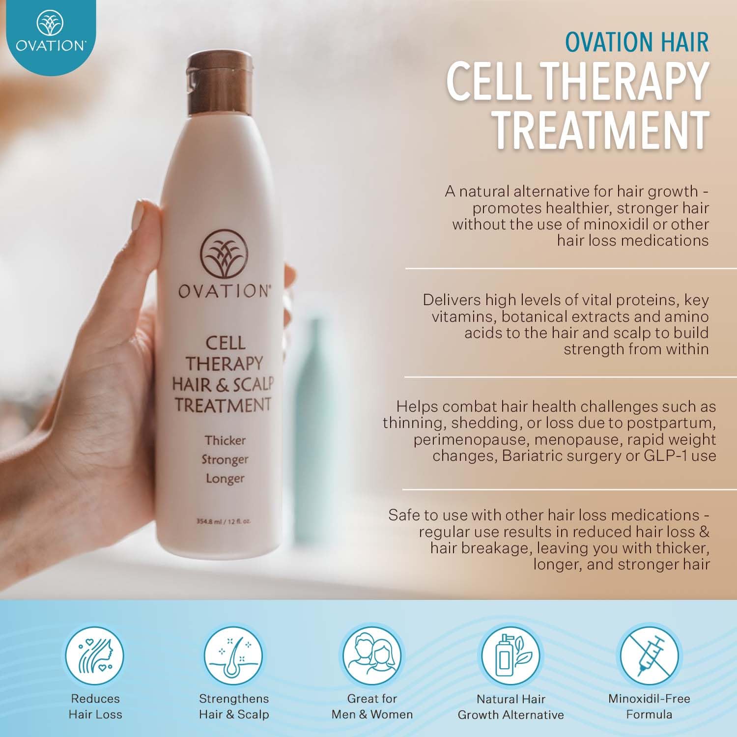- Combat Hair Thinning or Loss: Ovation's Cell Therapy is a medication-free hair and scalp treatment solution that helps combat hair health challenges such as thinning, shedding, or loss due to postpartum, perimenopause, menopause, rapid weight changes, Bariatric surgery or GLP-1 use.