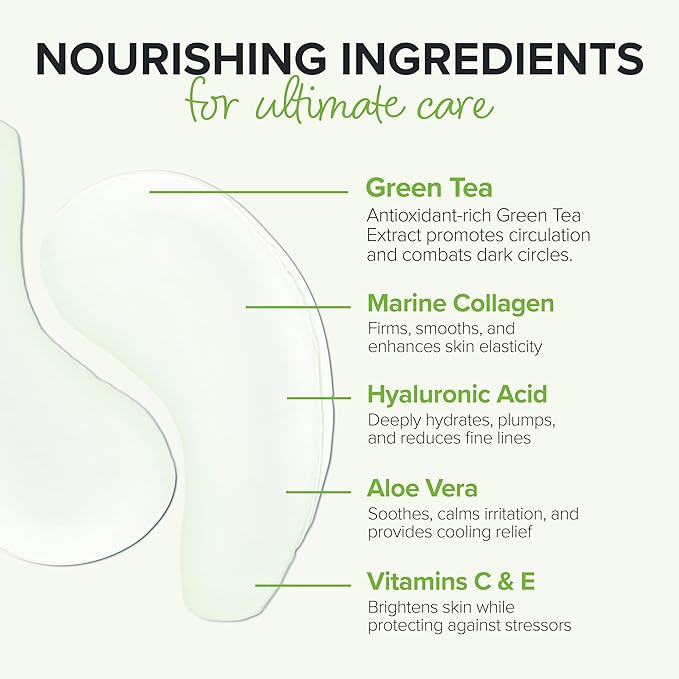 - NUTRIENT PACKED. Green Tea EYES collagen gel masks are micro-infused with a combination of hyaluronic acid, natural high-density marine collagen, enzymes, amino acids, natural marine minerals, trace elements, proteins and vitamins C & E.
