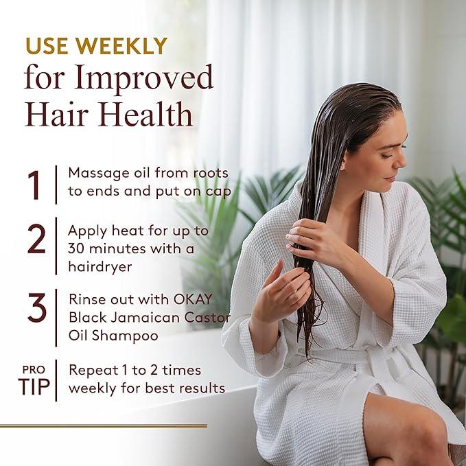 - Easy to Use - Apply as a leave-in or for deeper treatment, cover with a cap, add heat for 30 mins, then rinse. For best results, use with OKAY Black Jamaican Castor Oil Shampoo