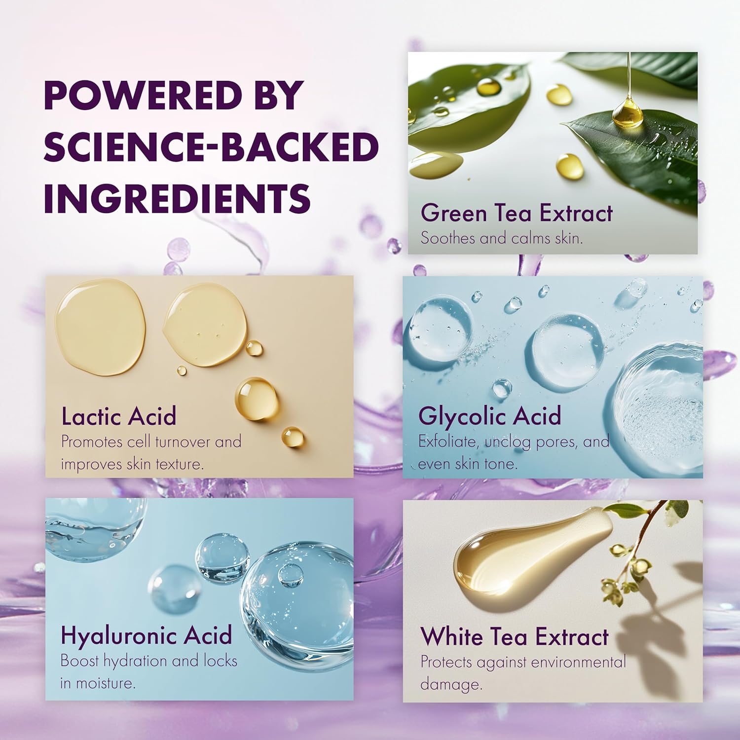 - Dual alpha-hydroxy acid formulation (glycolic & lactic).