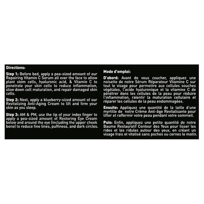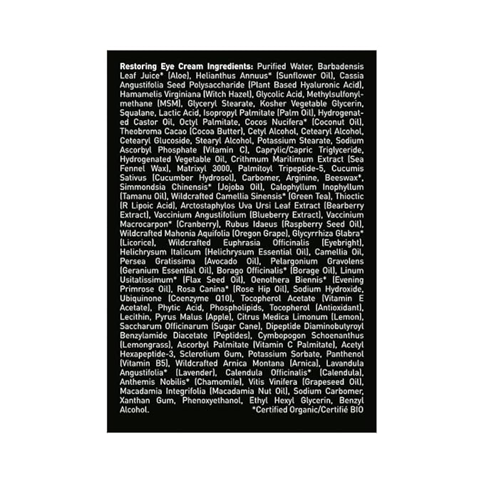 - Key Ingredients: Natural & Certified Organic ingredients, including aloe, DMAE, MSM, Plant Stem Cells, Vitamin C, hyaluronic acid, protein peptides, and caffeine.