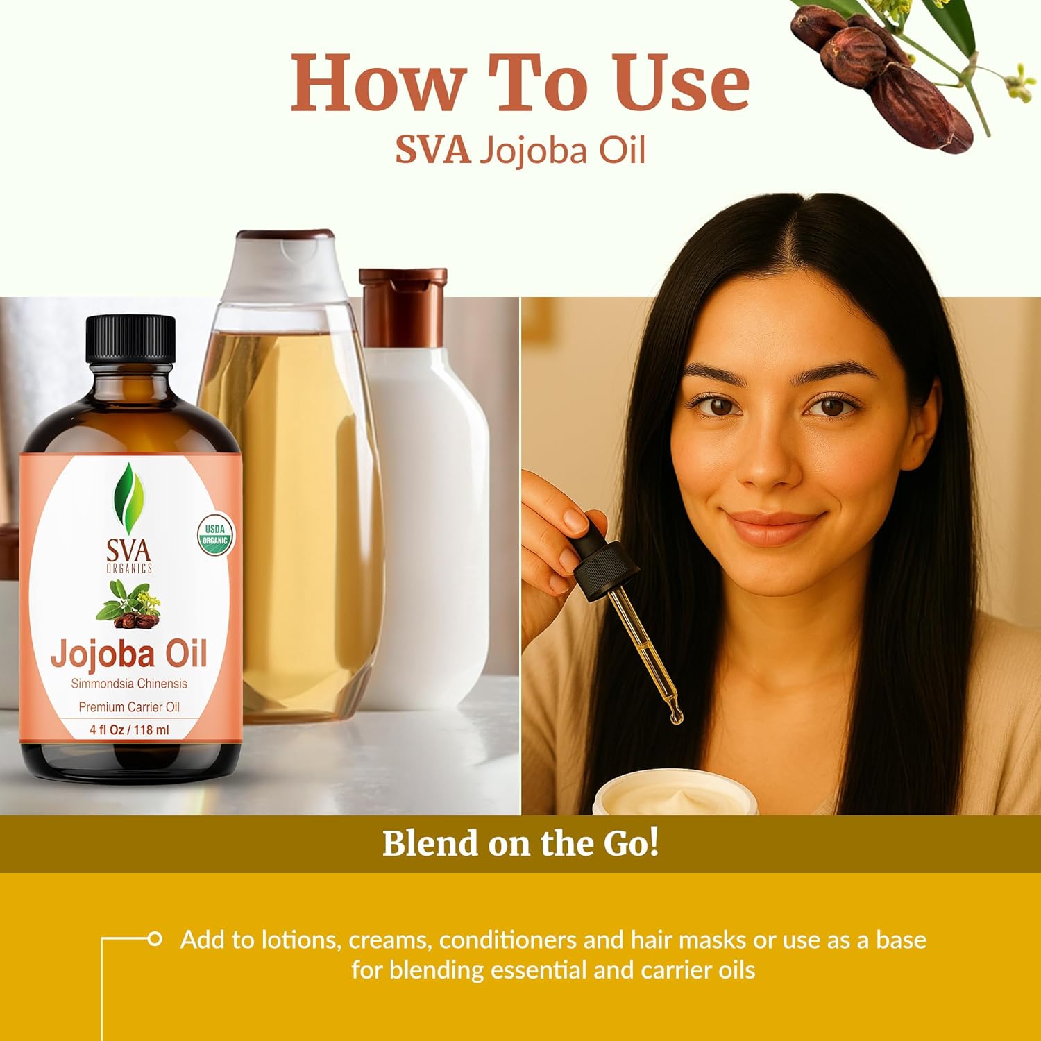 - Premium Quality Organic Jojoba Carrier Oil: SVA Organics Jojoba Oil 4oz is obtained by cold-pressed extraction of Simmondsia Chinensis seeds. Our pure Jojoba oil Organic is free of preservatives and comes with a dropper for easy application. It is not tested on Animals. We care for you
