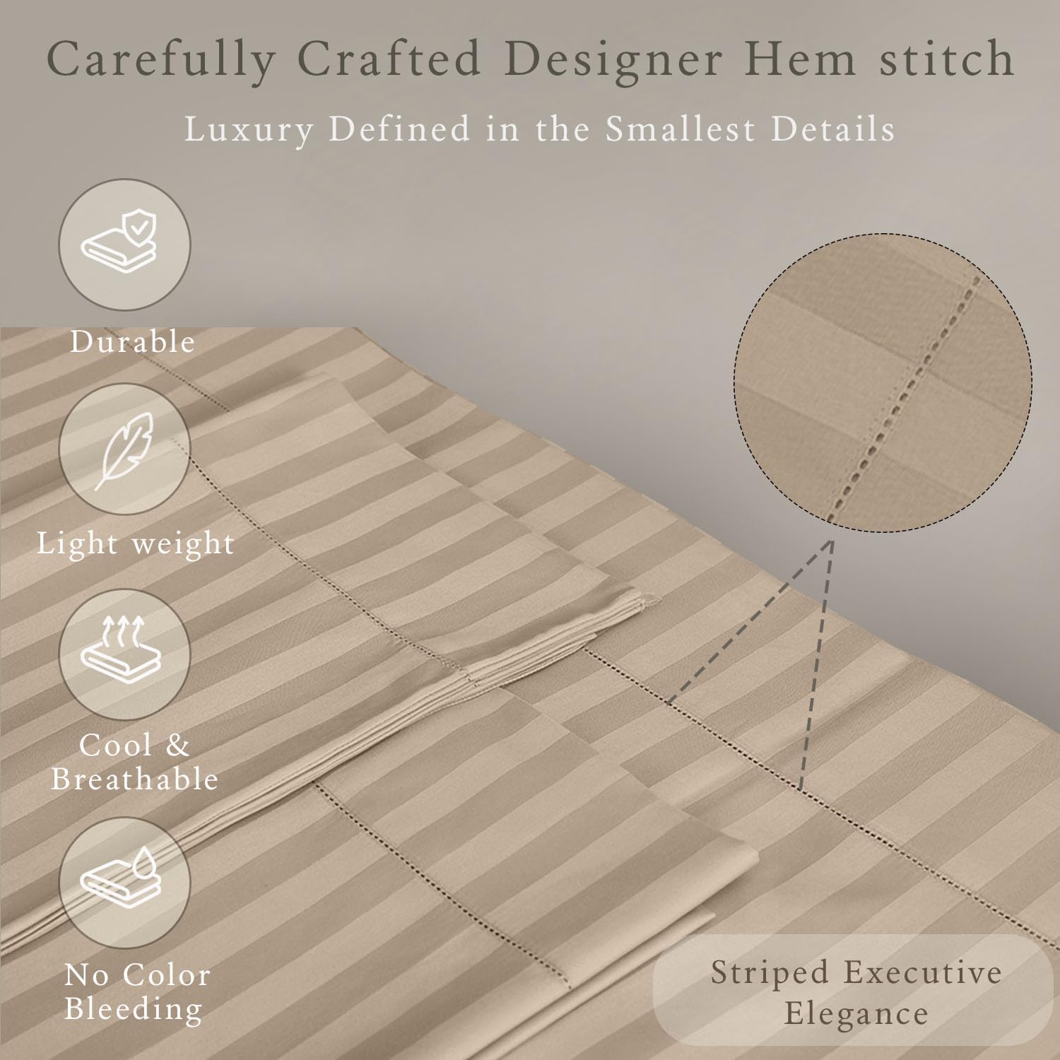 - 100% PURE COTTON & DAMASK STRIPE WEAVE FOR ULTIMATE SOFTNESS & BREATHABILITY: Made using extra-long staple cotton yarns, our 500 thread count sheet set is the perfect combination of smoothness, breathability, and durability. Detailed with a designer hemstitch and striped design, these damask sheets offer divine softness and modern style at a perfectly reasonable price. The lightweight bedding provides absolute comfort from night sweats, keeping you cool during summers and cozy during winters.