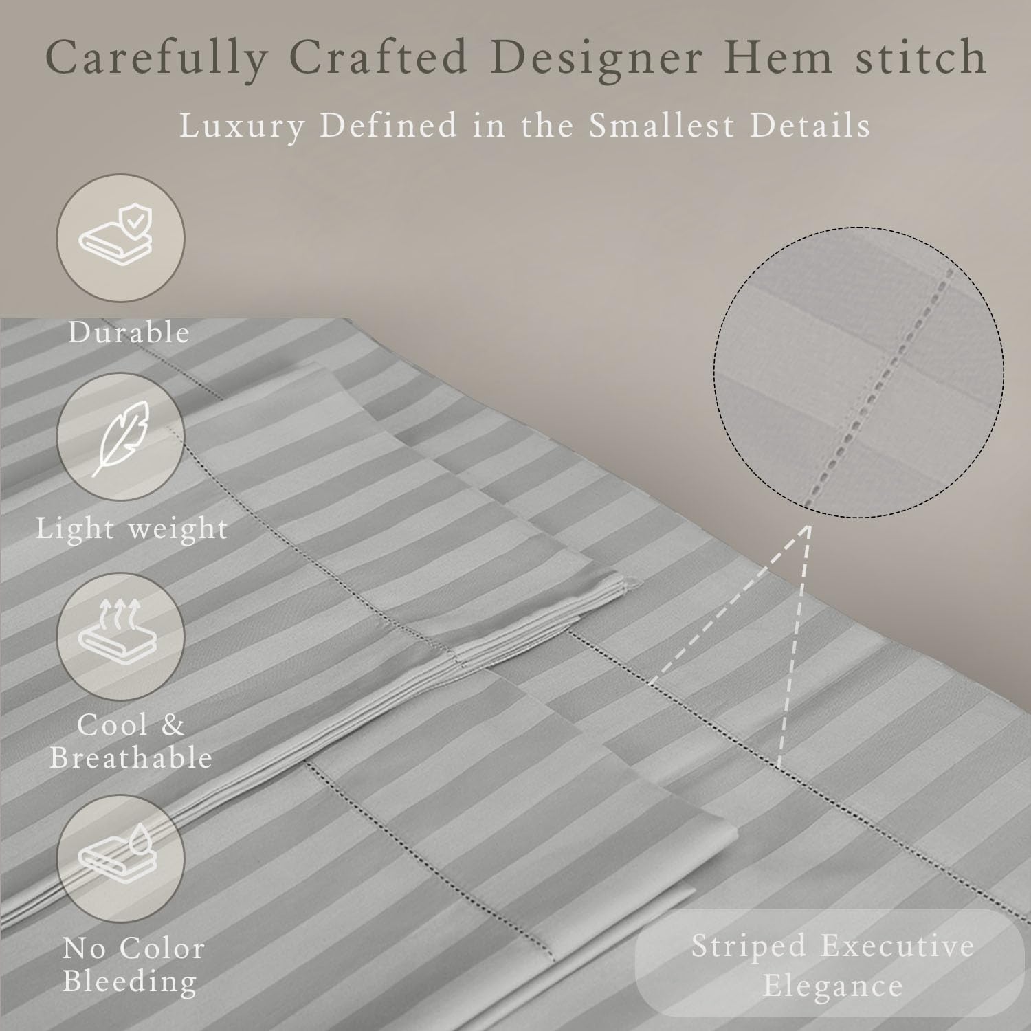 - 100% PURE COTTON & DAMASK STRIPE WEAVE FOR ULTIMATE SOFTNESS & BREATHABILITY: Made using extra-long staple cotton yarns, our 500 thread count sheet set is the perfect combination of smoothness, breathability, and durability. Detailed with a designer hemstitch and striped design, these damask sheets offer divine softness and modern style at a perfectly reasonable price. The lightweight bedding provides absolute comfort from night sweats, keeping you cool during summers and cozy during winters.