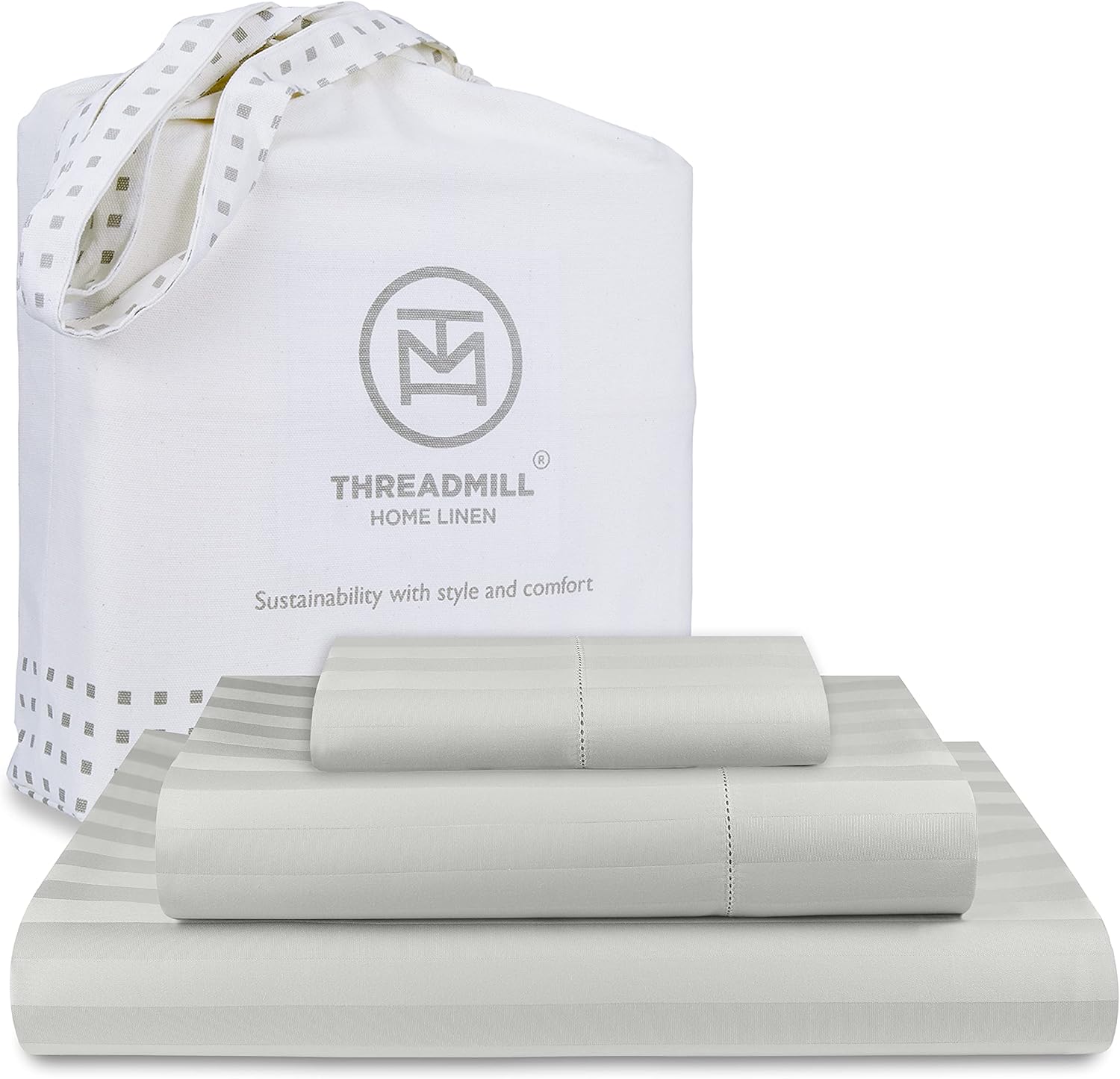 Threadmill 500 Thread Count Twin Size Damask Stripe, 3 Pc Luxury Cotton Bedding Set, Breathable Light Grey Sheets with 15" Elasticized Deep Pocket, 1 Pillowcase & Free Tote Bag