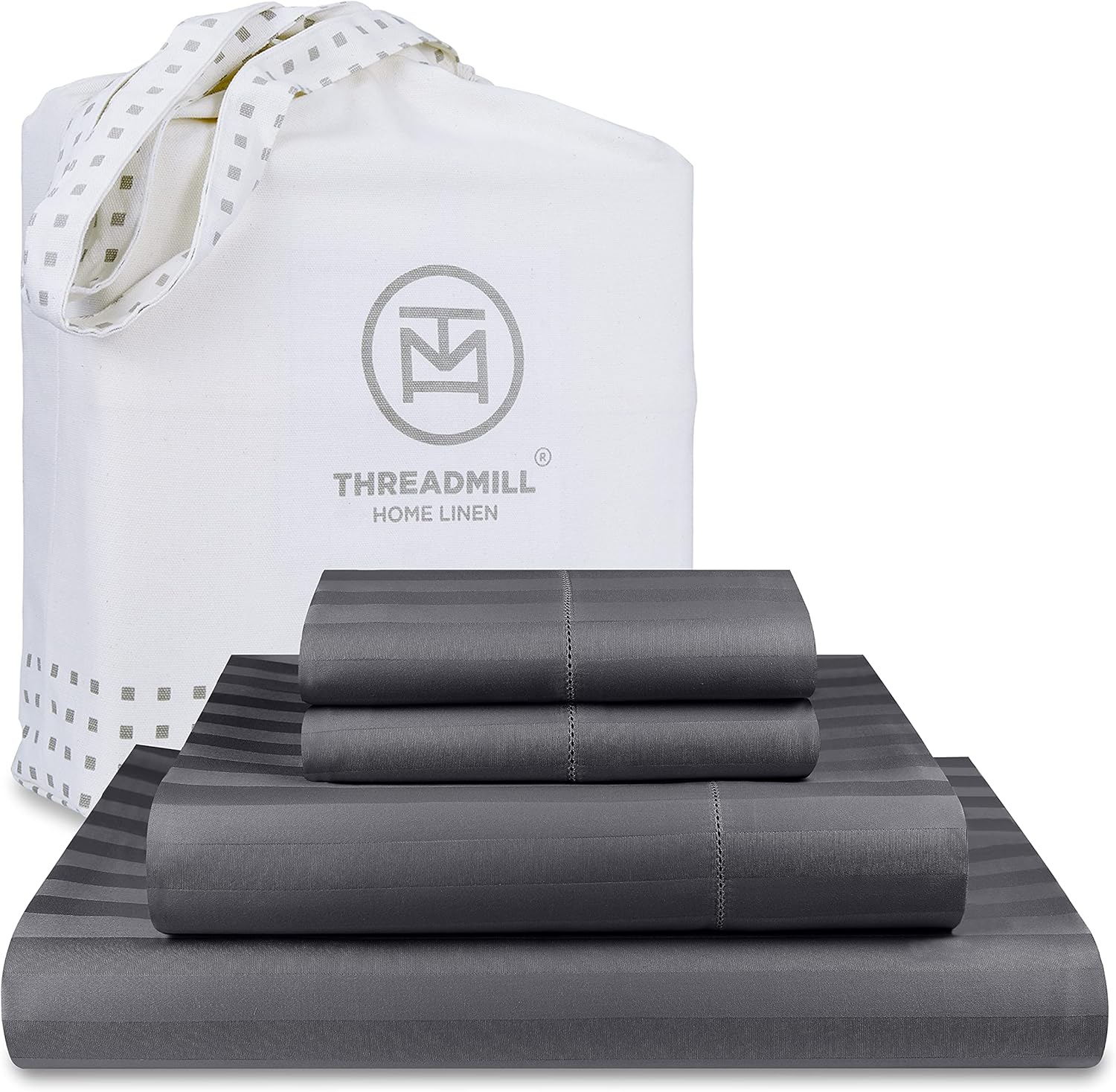 Threadmill 500 Thread Count Full-Size Damask Stripe, 4 Pc Luxury Cotton Bedding Set, Silky Smooth Dark Grey Sheets with 16" Elasticized Deep Pocket, 2 Pillowcases & Free Tote Bag