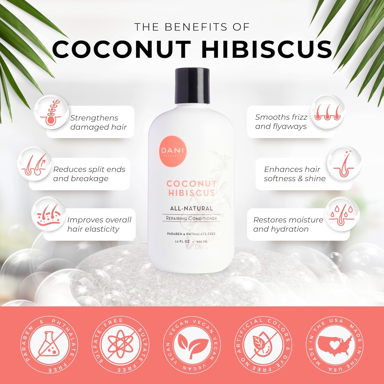 DANI Naturals Conditioner – Coconut Hibiscus, Strengthening & Hydrating for Dry or Damaged Hair, Lightweight & Nourishing, Vegan & Color-Safe, 12 oz