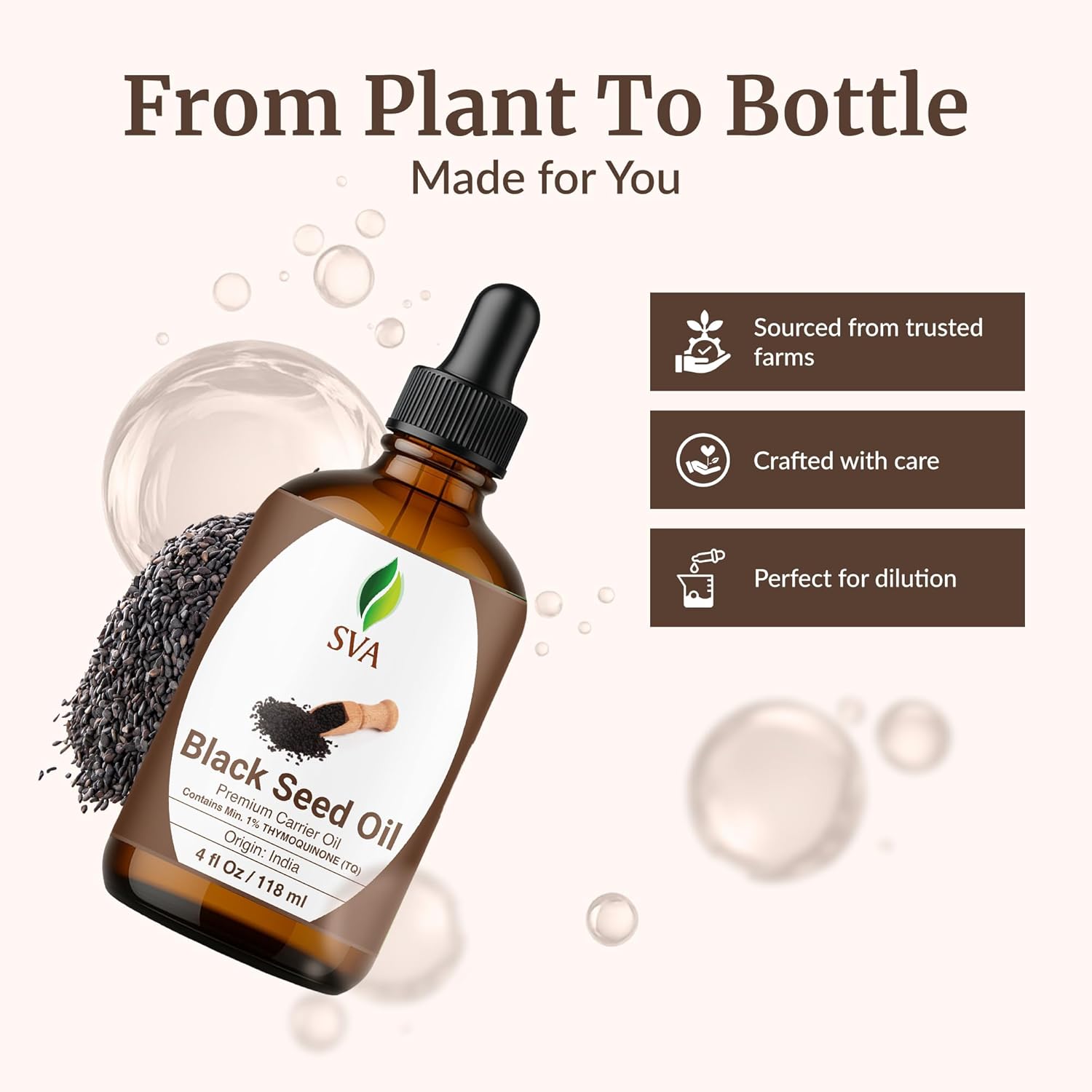 - PREMIUM QUALITY BLACK SEED OIL: SVA Black seed oil is obtained by cold pressing the seeds of the Nigella Sativa plant. Our Black Seed oil is Hexane-free and free of preservatives and comes with a dropper for easy application. It is not tested on Animals. We care for you! It is Indian Origin dark-colored strong oil and is also known as Kalonji oil or Nigella Sativa oil.