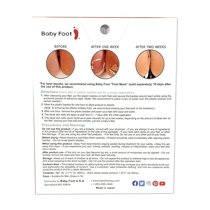 - NATURAL EXTRACTS - Baby Foot peel exfoliator is the original peeling mask crafted from 16 natural extracts including orange, grapefruit, sage, and chamomile; the fruit acid in our proprietary gel reduces the adhesive power between dead skin layers to naturally exfoliate and leave your feet baby soft. This foot peel is great to share with your family and friends. Let them enjoy baby soft, healthy feet with you.