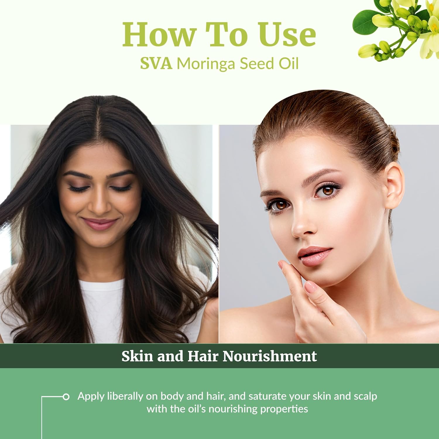 - How To Use: SVA Moringa Oil is easy to use. Put a few drops on your palm and gently massage on your scalp for a few minutes. Leave it for 30 minutes and wash your hair with a mild Shampoo. You may use Moringa oil for hair and leave the oil overnight for better results