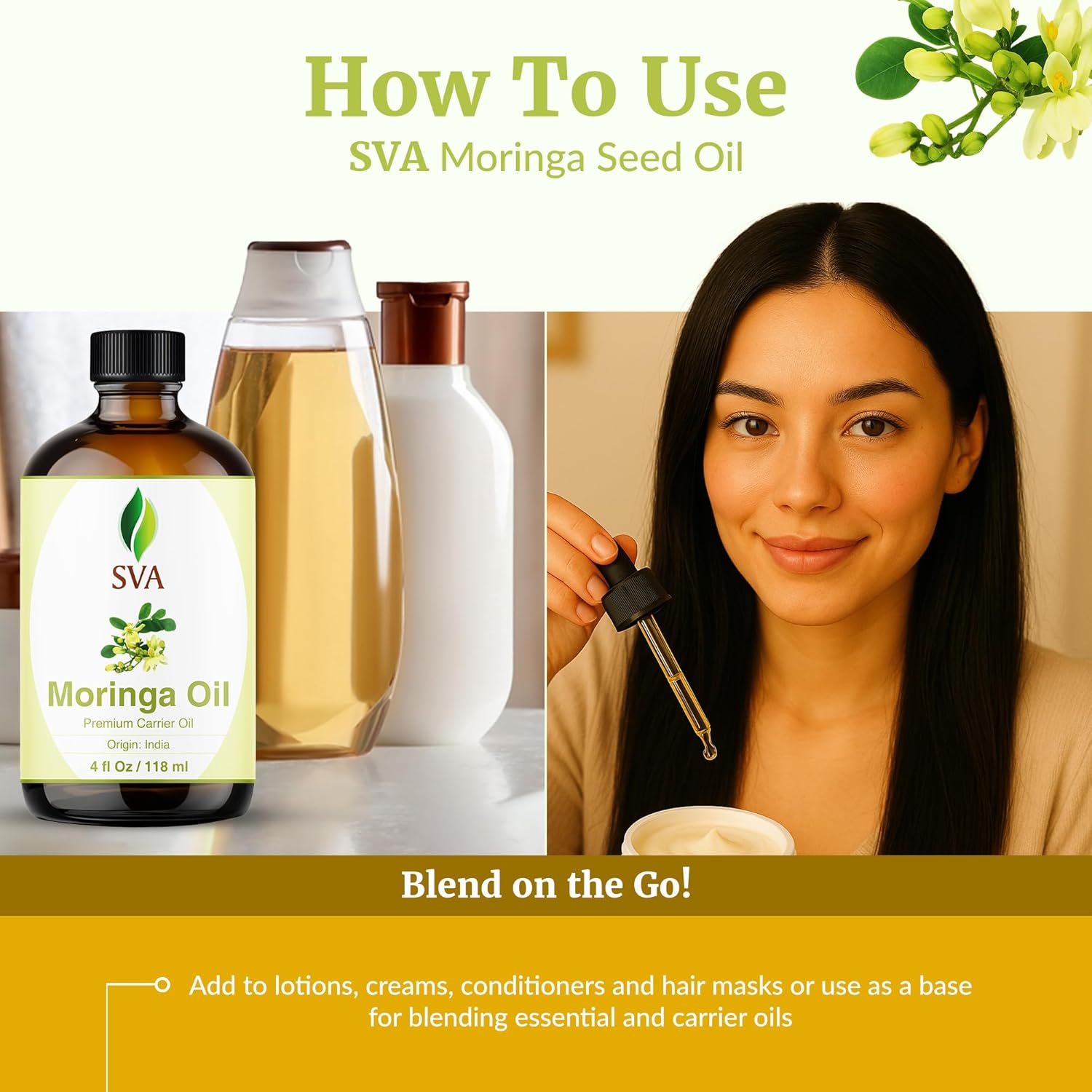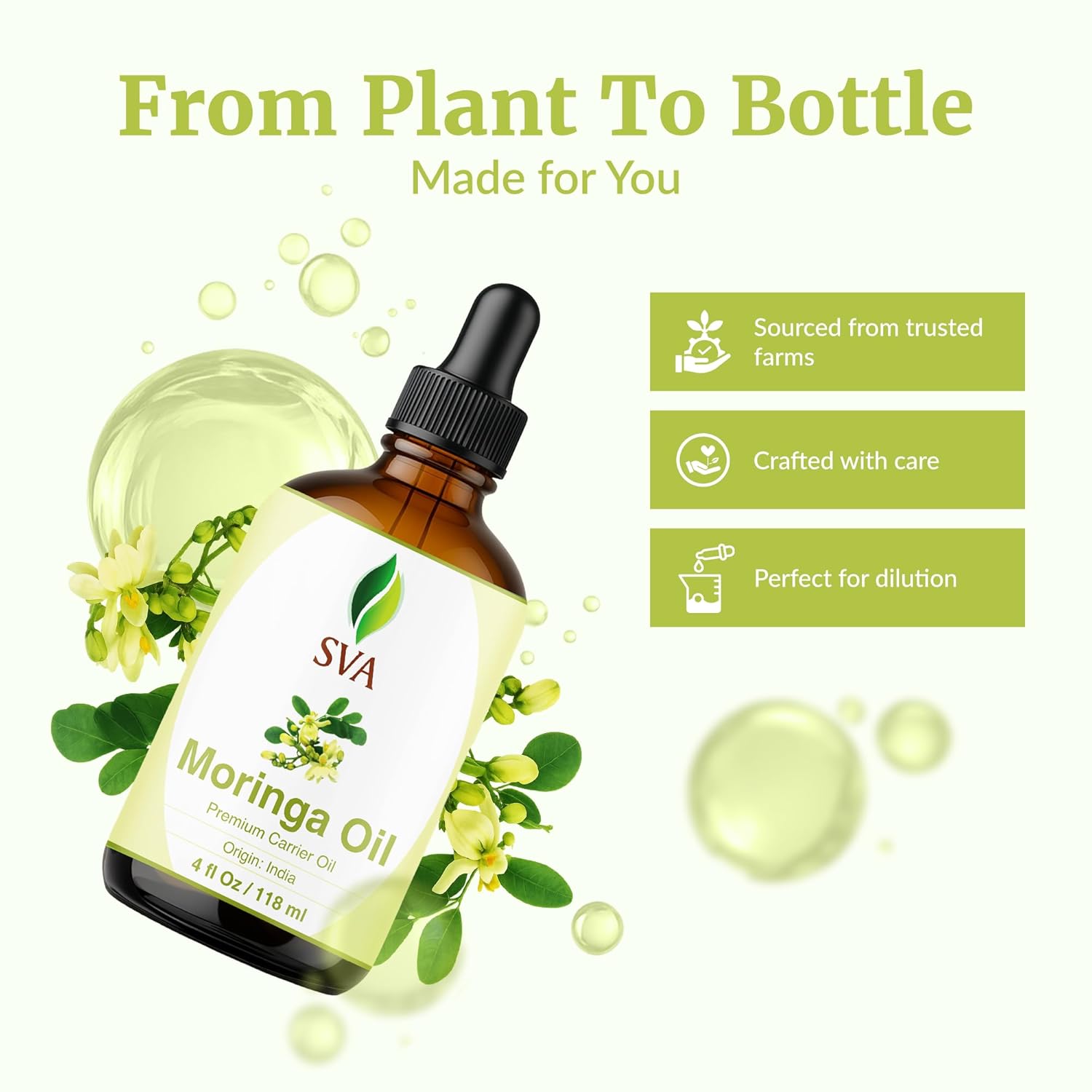 - Premium High-Quality Moringa Carrier Oil: SVA Moringa Oil is obtained by cold-pressed extraction of Moringa oleifera seeds. Our Moringa oil is free of preservatives and comes with a dropper for easy application. You can get our Moringa oil in a glass bottle. It is not tested on Animals. We care for you