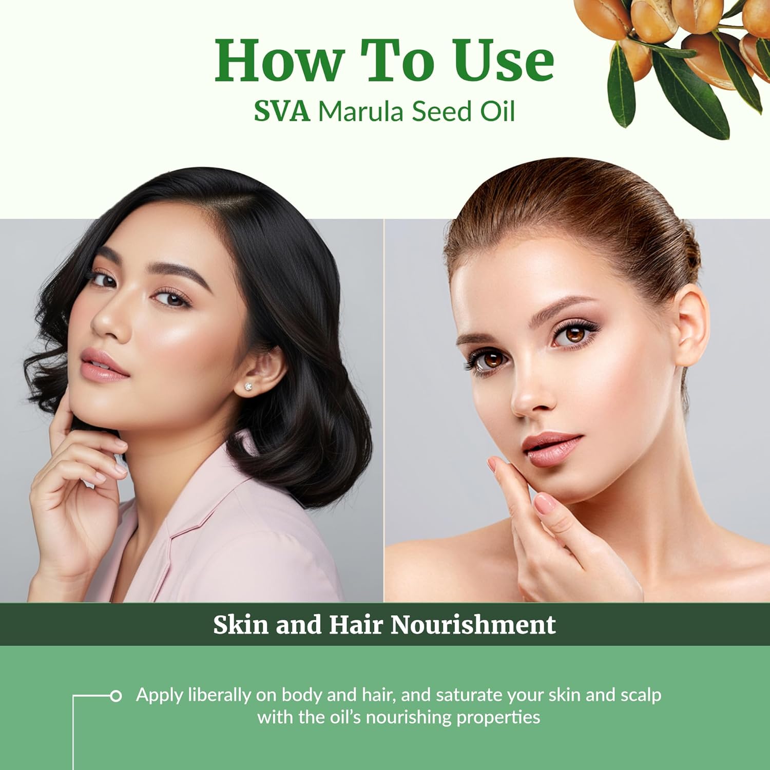 - How To Use: SVA Marula Oil 4 Oz is easy to use. Extract a few drops of the oil on your palms and gently massage on your scalp and body for a few minutes. Leave it for 30 minutes and wash off with a gentle cleanser. You may use Organic Marula oil for face and hair and leave the oil overnight for better results.