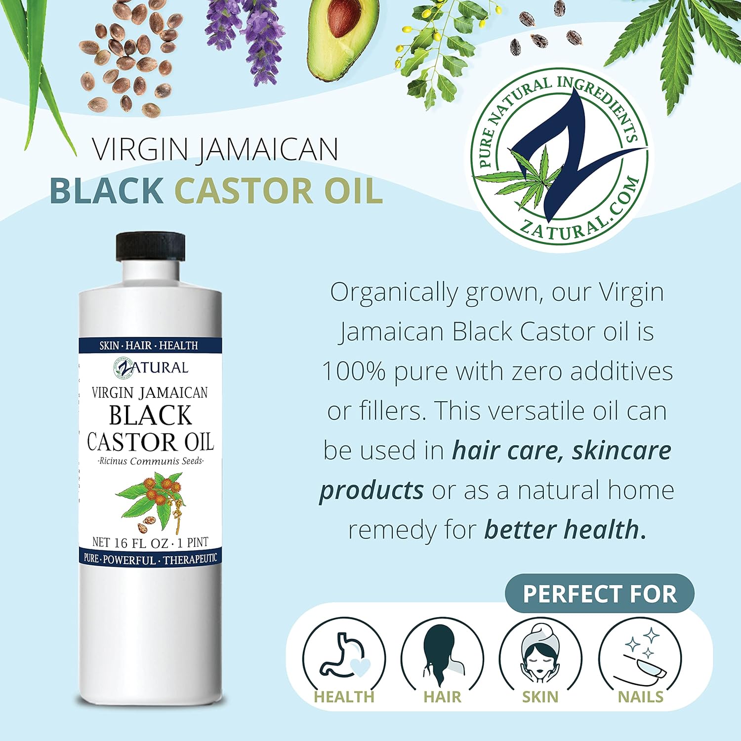 - BLACK CASTOR OIL FROM ZATURAL: Our oil is 100% pure Jamaican, known to be the highest quality black castor oil on the market. Black castor oil has an extensive list of benefits when applied to hair, skin, and nails.