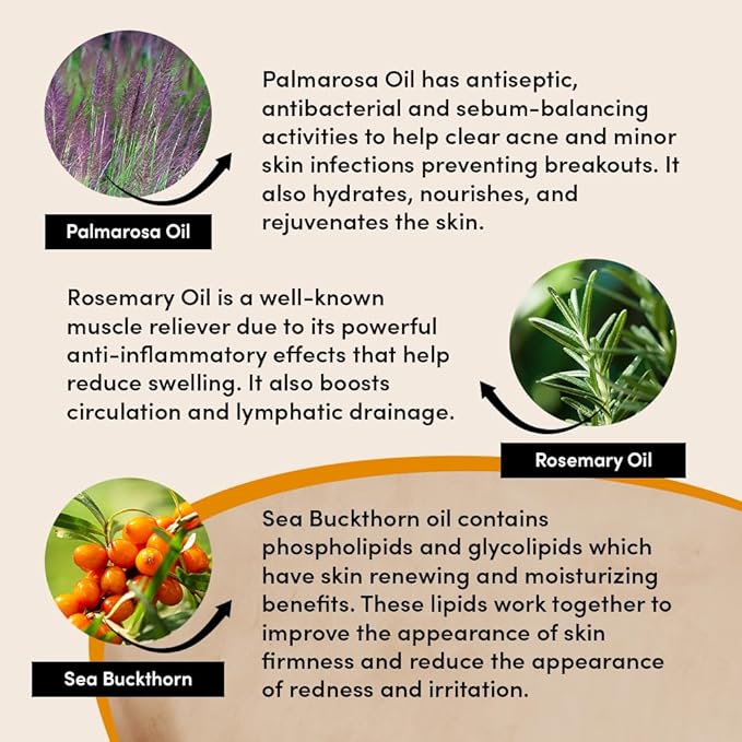 - Soothes and Calms: Sandalwood, Myrrh, and Rosemary oils offer deep soothing properties for dry, sensitive, and inflamed skin. These oils also have uplifting and balancing effects, reducing puffiness and calming the mind while healing chapped or cracked skin.