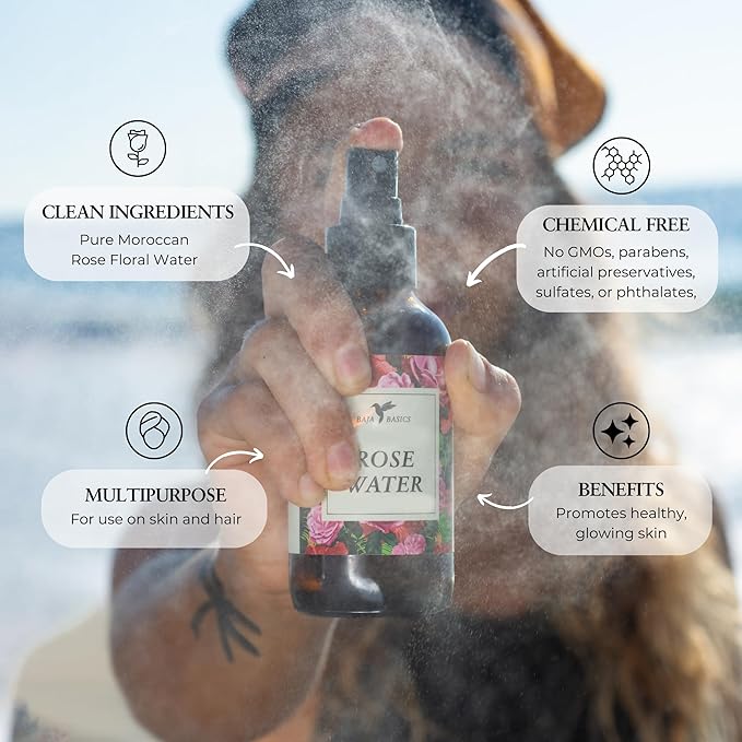 Rose Water Spray Facial Toner by Baja Basics for Skin, Hair and Aromatherapy Large 4oz