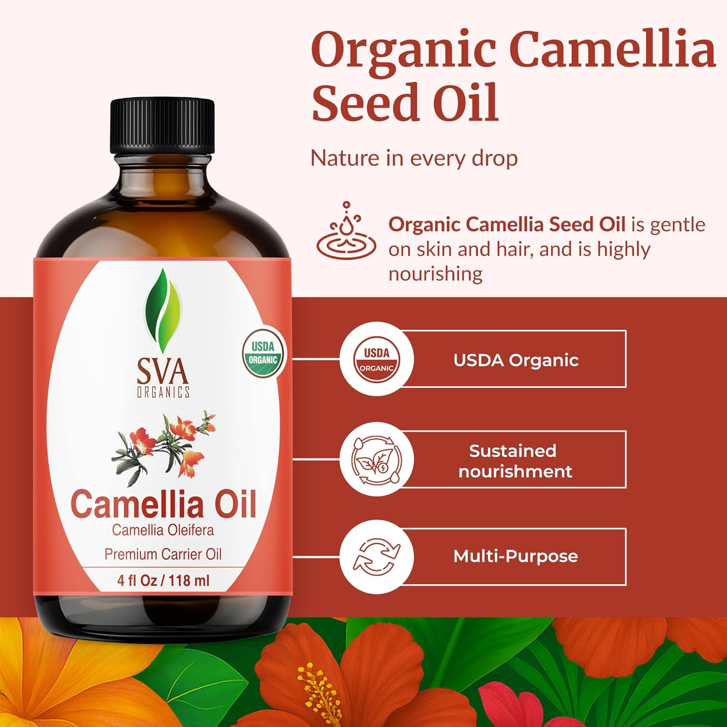 SVA Camellia Seed Oil Organic - 4 Fl Oz – 100% Natural Cold Pressed Organic Camellia Oil - for Face, Skin Care, Hair Care, Scalp Massage & Body Massage – Carrier Oil with Dropper
