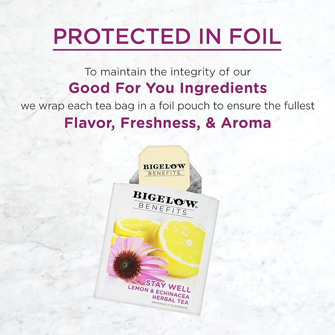 - Individually Wrapped: Bigelow Tea always come individually wrapped in foil pouches for peak flavor, freshness and aroma to enjoy everywhere you go! Gluten -free, calorie-free, and Kosher Parve