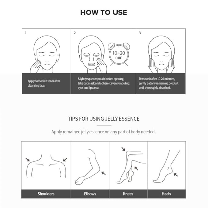 - Cooling Effect: Infused with ice plant extract and menthol to provide an instant cooling sensation, reducing skin temperature by up to 5°C. This set includes 10 Korean jelly face masks designed to deeply hydrate and nourish your skin for a radiant glow.