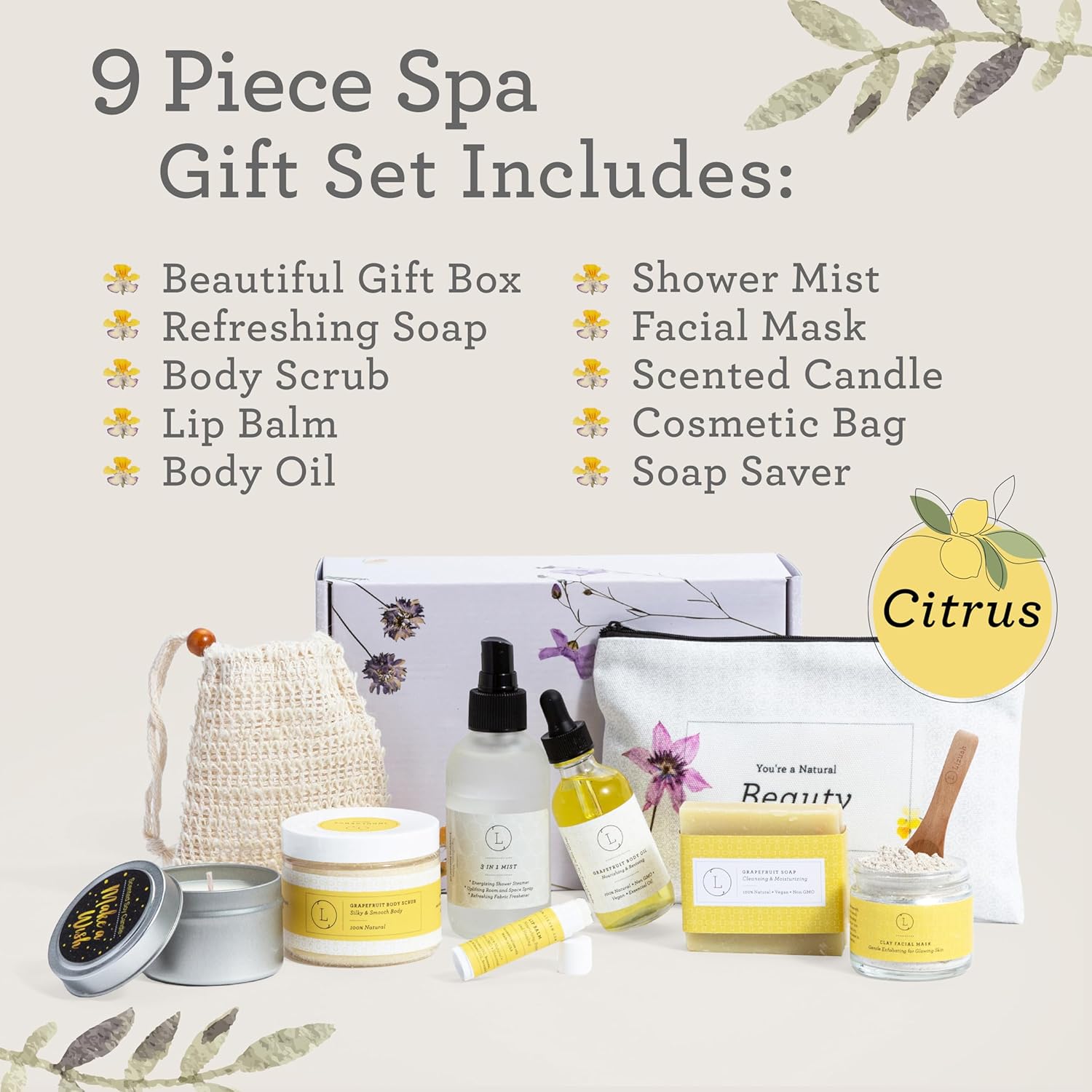 - SPA DAY KIT FOR WOMEN: Relax with this citrus bath set and gift box for women, which includes a citrus soap bar, a grapefruit soap bar, body scrub, shower mist, a clay mask, lip balm, a “Make a Wish” soy candle, a soap saver pouch, and a makeup bag.