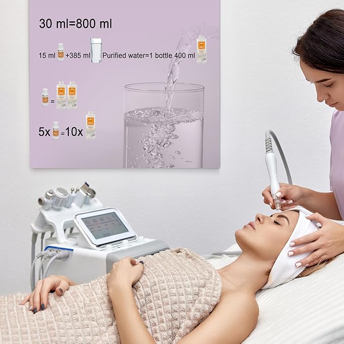 - How to use: each 30 ml bottle can be used with water dilute to 800 ml. Data shows that half a bottle 15 ml bottle can be used with water in 400 ml (the effect is fine).The 30 ml concentrated solution is suitable for microdermabrasion, hydro beauty and hydrofacial Machine. A 30ml bottle should be diluted from 370 ml to 770 ml depending on the desired concentration, so that the starting base contains between 400 ml and 800 ml.