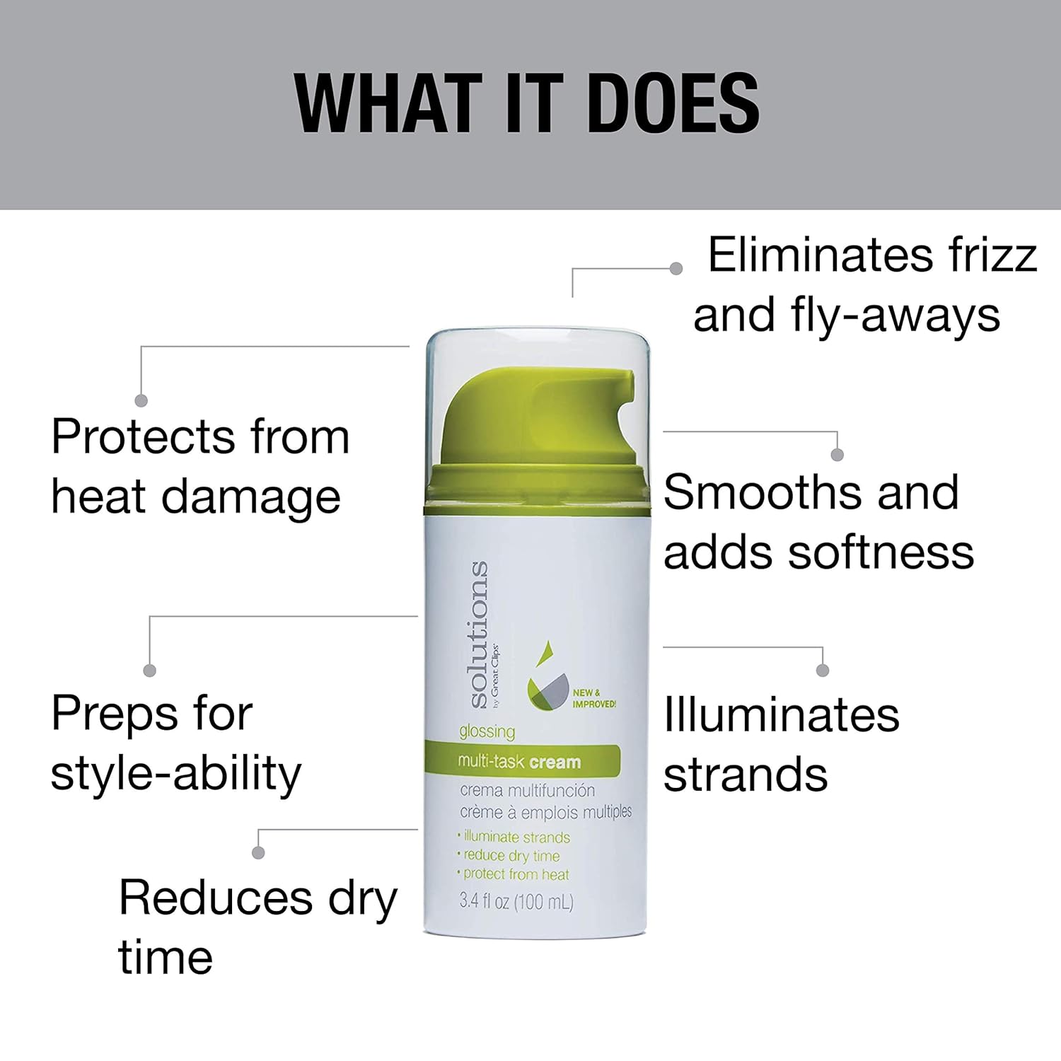 - A LIGHT CREAM THAT DOES IT ALL: Solutions by Great Clips Glossing Multi-Task Cream is an all-in-one, daily hair care solution that assists with problems, such as taming frizz & fly-aways, smoothing hair, and illuminating each hair strand.