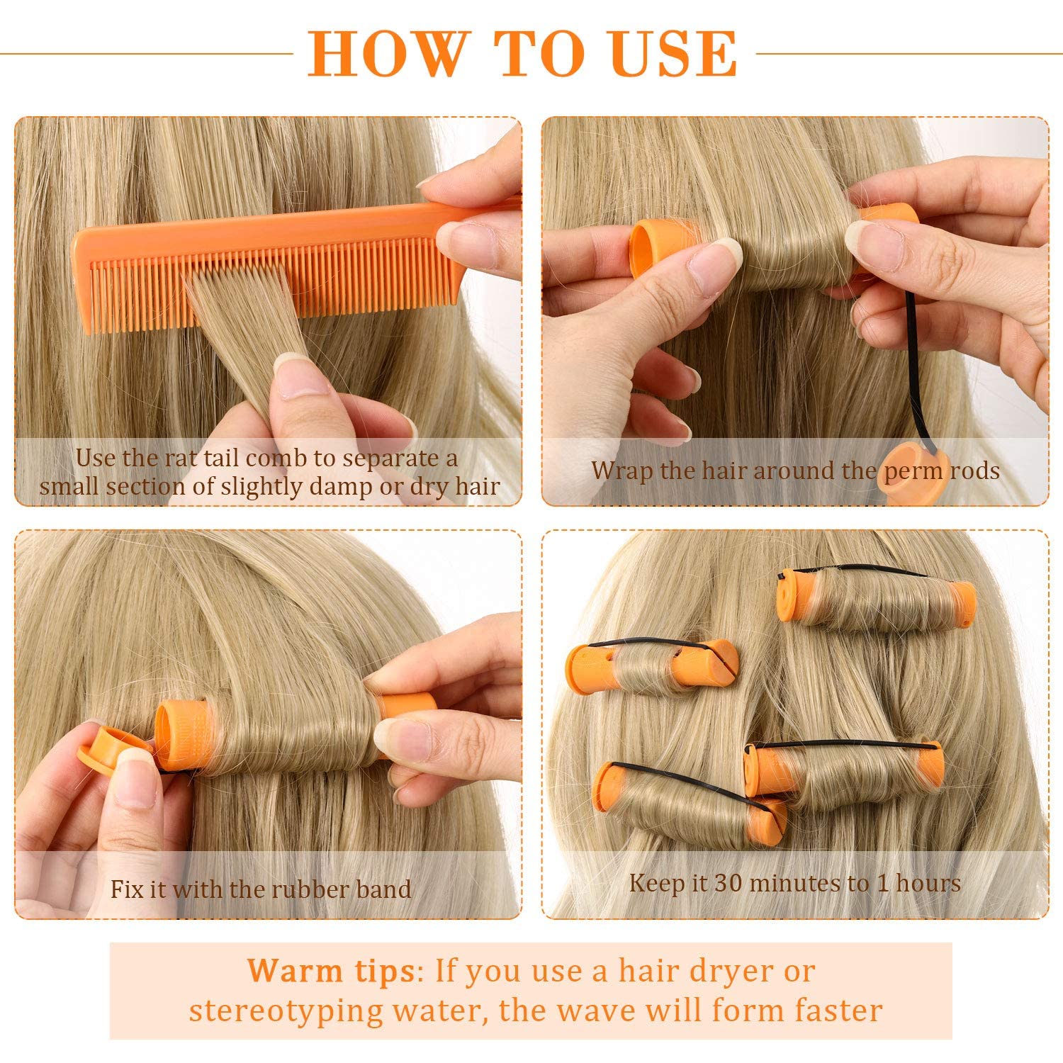 - Simple to apply: just use the rat tail comb to separate a small handful of slightly damp or dry hair, and wrap it on the rods; Then use the rubber band to fix it, does not require heating, no harm to the hair; Just wait for a while, you can make a natural curling hairstyle, adjust the direction of starting roll hair in or out can create various hair wave