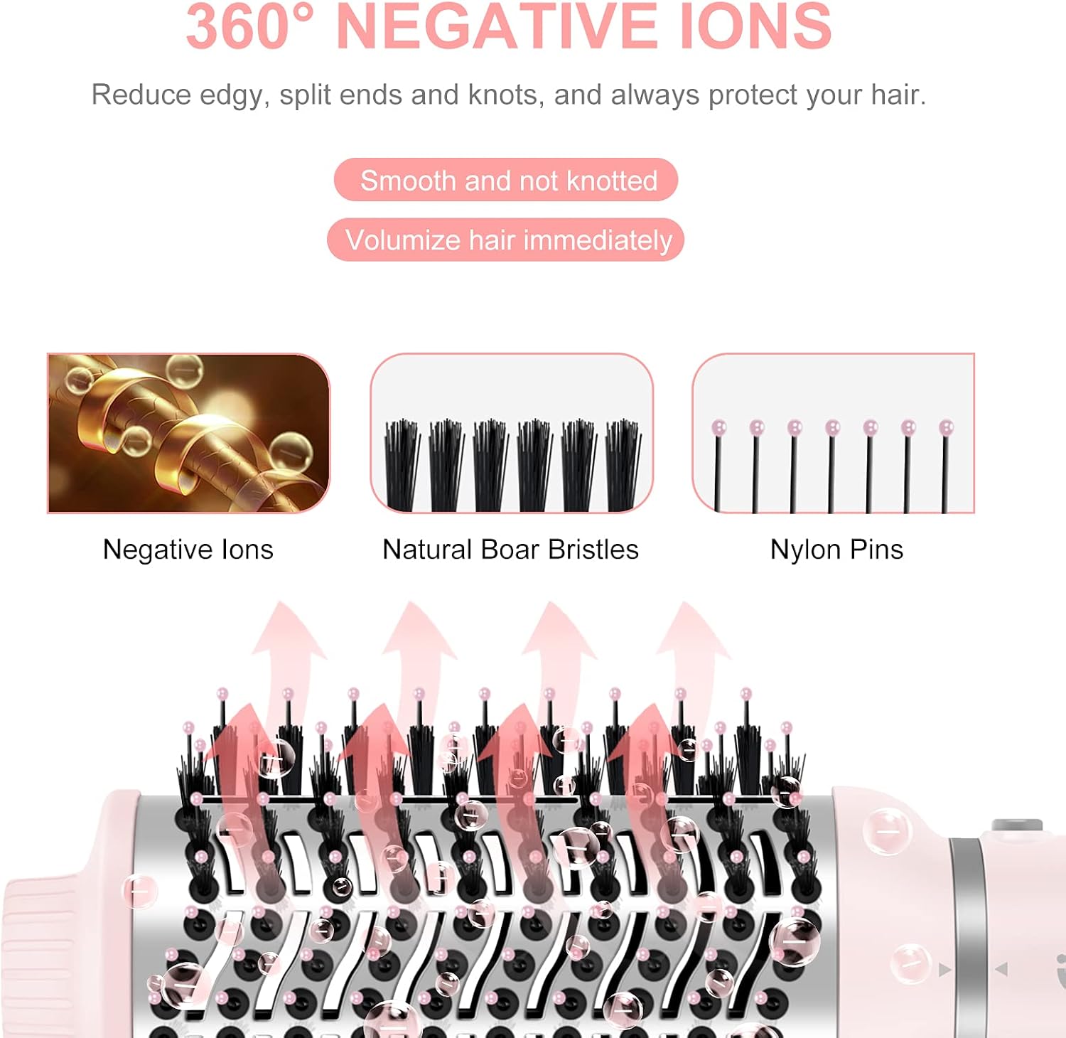 - Negative Ions Technology - Featured by a built-in generator that releases negative ions, the hair dryer brush head made by nylon bristles and nylon pins helps to maintain neutral electric charge on the hair surface, reducing static and leaving healthy and shiny hair.