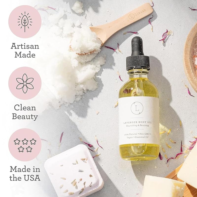 Lizush Lavender Body Oil - 2 oz Natural, Vegan, Non-GMO Moisturizing Bath Oil for Silky Skin with Premium Essential Oils - Handmade in the USA