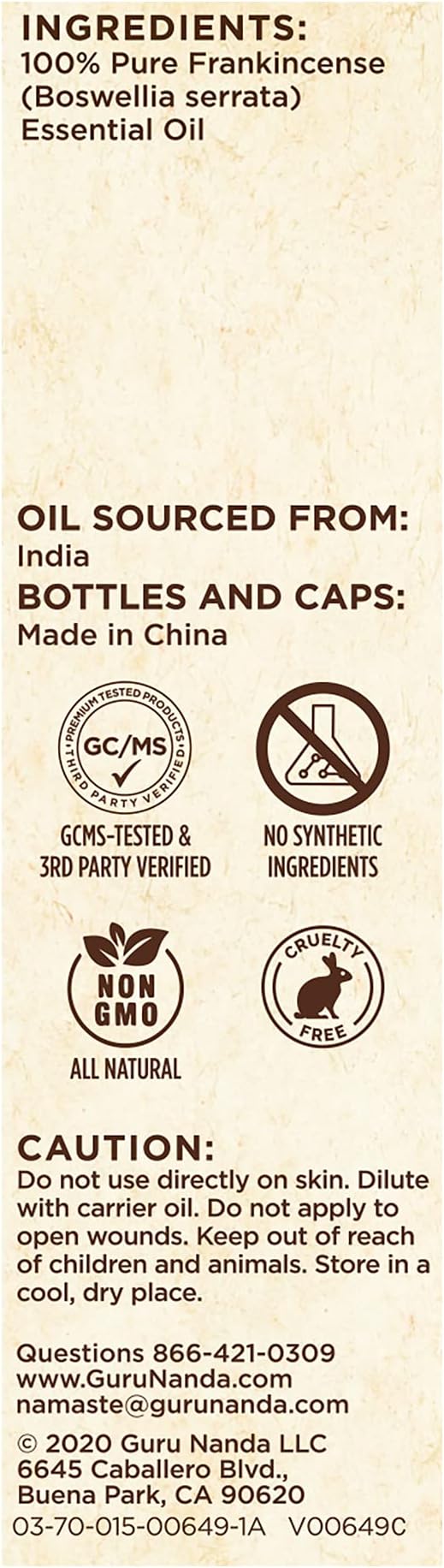 - GuruNanda's Frankincense essential oil is 100% pure & natural. Sourced directly from the farms of India, it is packaged in the USA and boasts an enchanting aroma with no added artificial fragrances