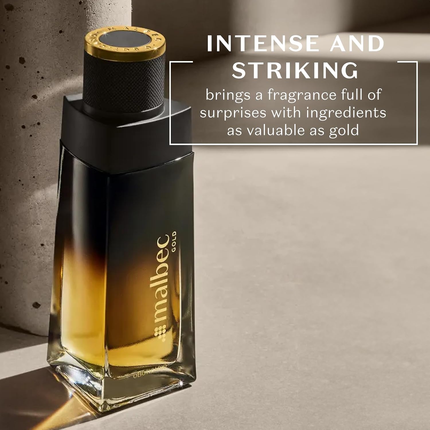 Malbec Exquisite Gold Eau de Toilette By O Boticário, Cologne For Men Long Lasting Men's Fragrance, French Oak Barrel-Aged Red Wine & Amber Scent, 3.4 Ounce