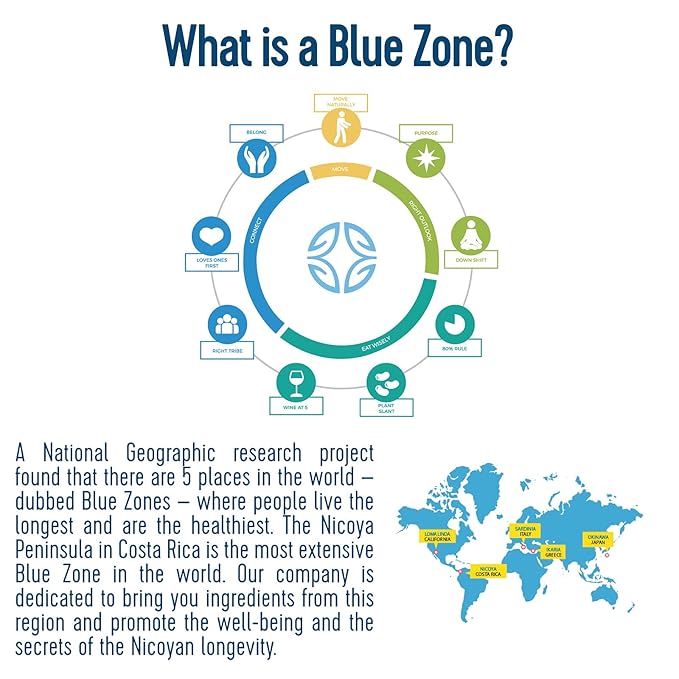 - Secrets of the Blue Zones: This tea is sourced from Costa Rica's Nicoya Peninsula, a renowned Blue Zone known for exceptional longevity. Like other Blue Zones such as Okinawa, Sardinia, and Loma Linda, Nicoya emphasizes unique dietary habits, strong social connections, active lifestyles, and a sense of purpose, all contributing to longer, healthier lives in these regions.