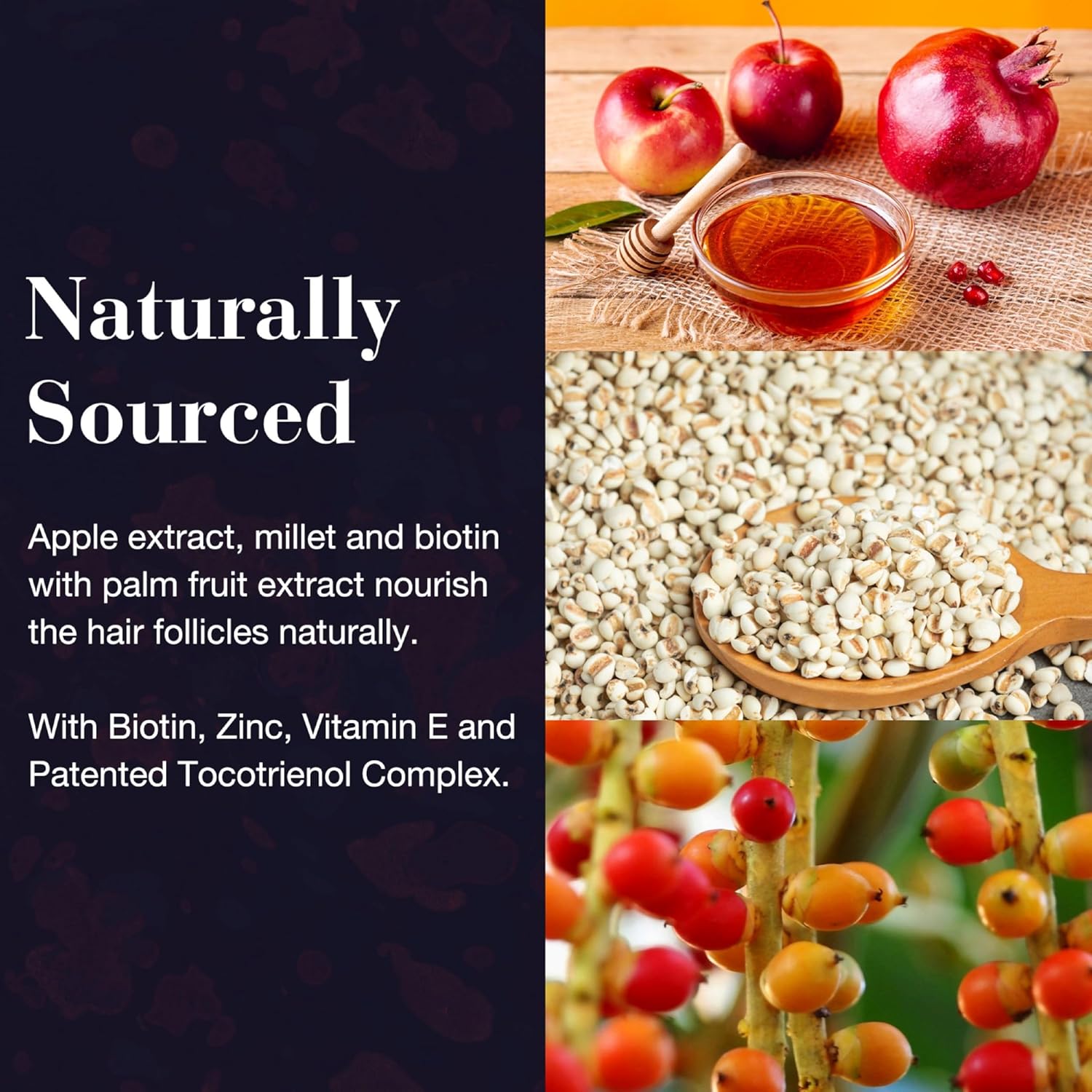 - NATURALLY SOURCED - Apple extract, millet and biotin with palm fruit extract nourish the hair follicles naturally