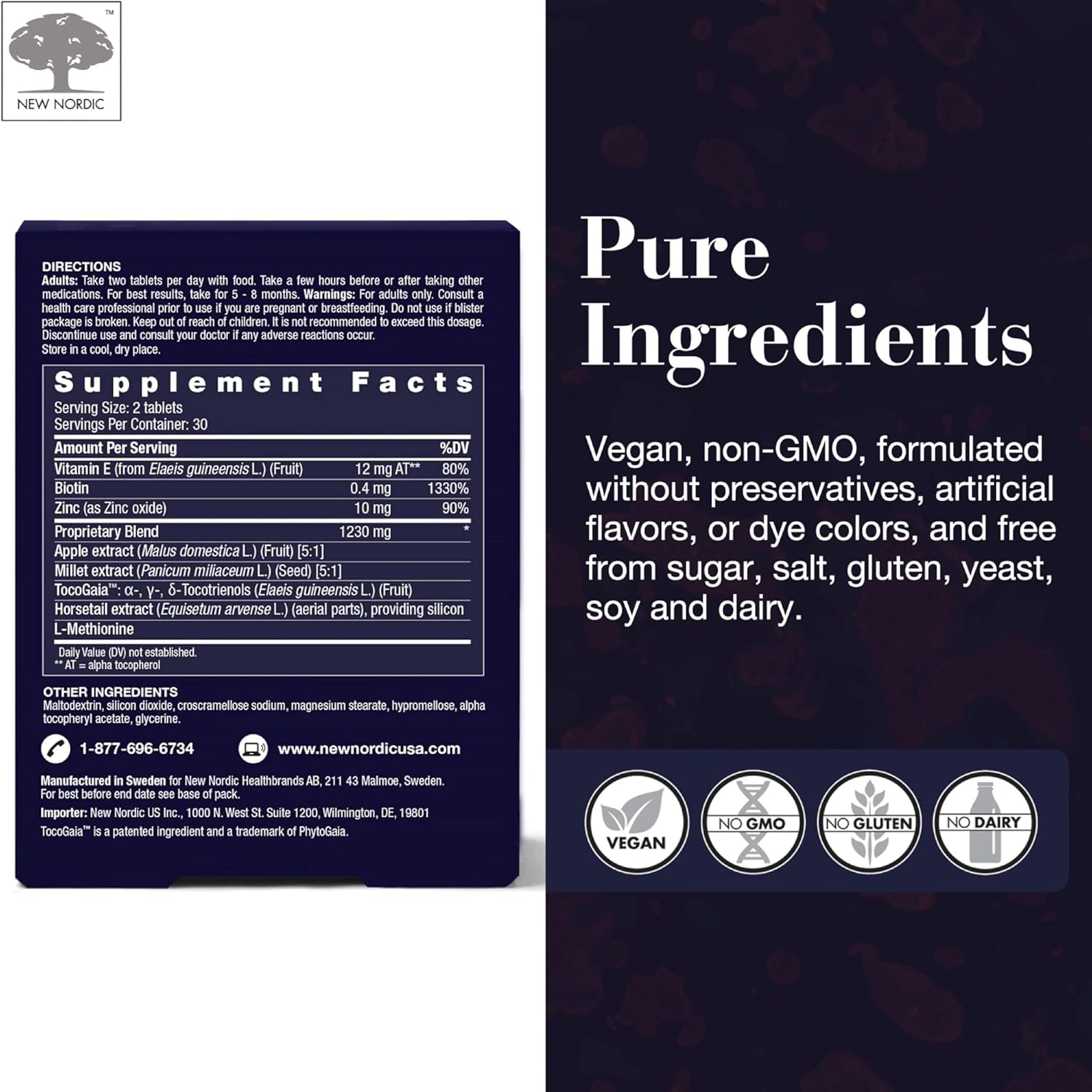 - Primary Supplement Type : Vitamin E, Biotin, Zinc, Apple Extract, Millet Extract, TocoGaia, Horsetail Extract, L-Methionine