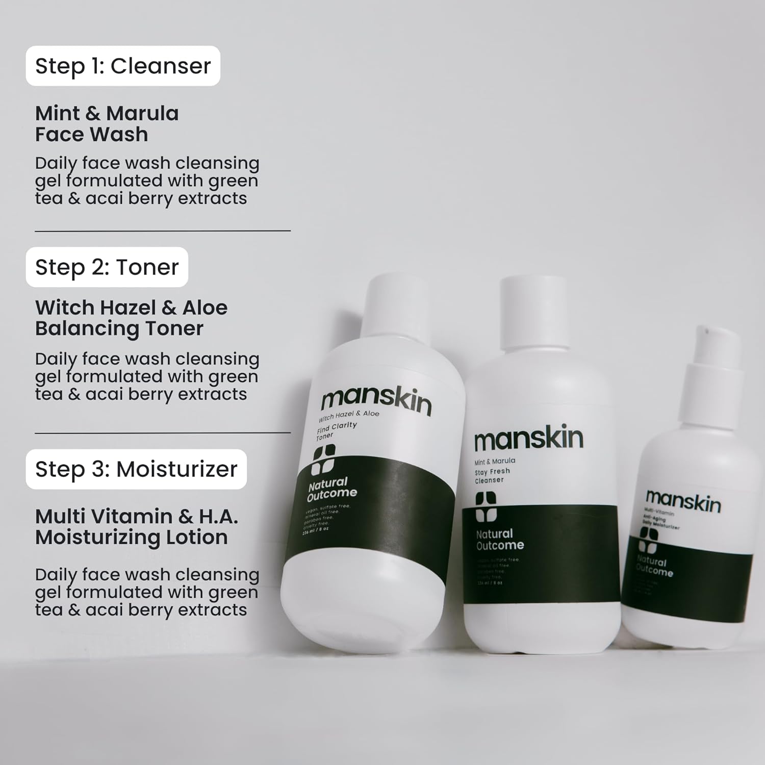- 3-Step Face Care Kit - Natural Outcome daily facial kit for men contains our featured Man Skin products to help revive and refresh skin for anti aging and healing acne. Quality guaranteed premium mens face care full sized skin care products packed in a attractive box perfect for gifting to men for everyday grooming.