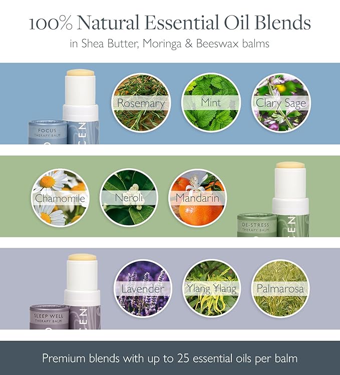 - PREMIUM ESSENTIAL OIL BLENDS: 100% NATURAL – 'Sleep Well' combines Lavender, Ylang Ylang, and Palmarosa as a natural sleep balm, 'De-Stress' blends Chamomile, Neroli, and Mandarin for anti-stress support, and 'Focus' features Rosemary, Mint, and Clary Sage for enhanced concentration. All balms are in a Shea Butter and beeswax base and are vegetarian-friendly.