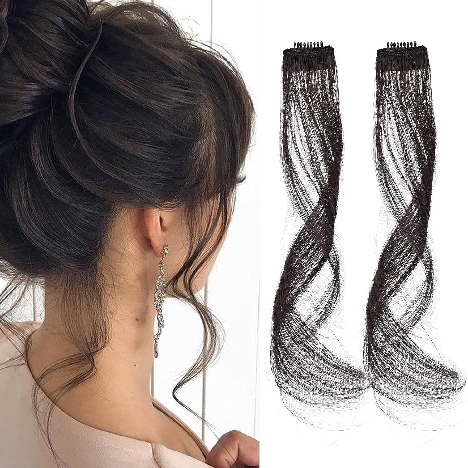 REECHO Long Side Air Bangs - Wavy Curly Clip in Curtain Front Side Bangs, Face-Framing Highlights for Women Daily Use, 2 PCS Set Long Temples - Black Brown