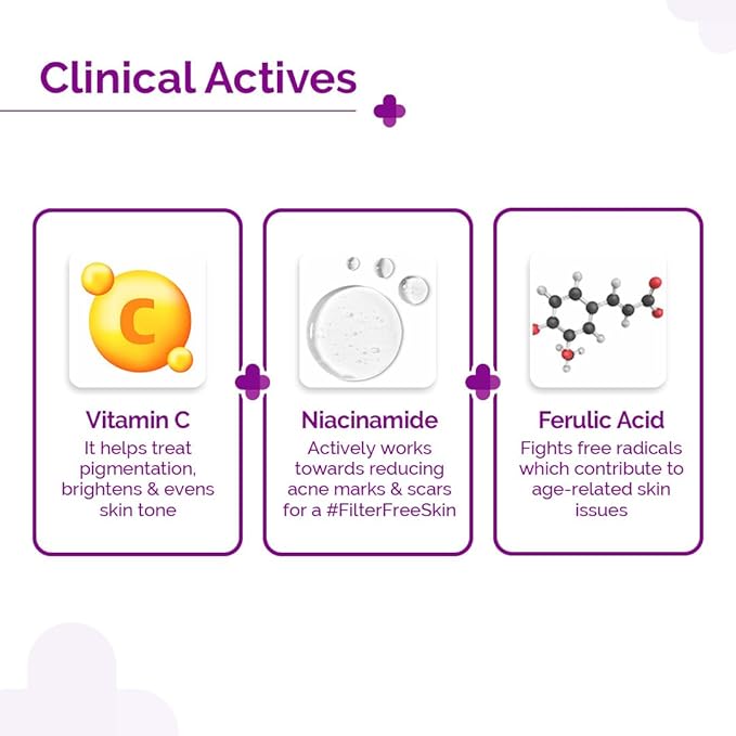 - MINIMIZES OPEN PORES:The combination of 5% Niacinamide and 10% Vitamin C accelerates cell regeneration and boosts collagen, thereby helping the skin to shed dead cell build-up from the surface and allowing new and healthy skin layers to take their place. This skin regeneration process also pushes out debris clogged inside pores, ensuring no room for any bacterial infection like acne while also making them less visible and more normal-sized. You and your skin can now confidently go #FilterFree