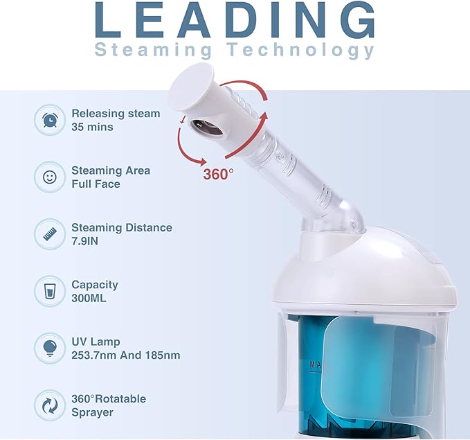 - 【360° Rotatable Sprayer】: The steam pipe can be rotated at any angle of 360°, you can lie down, stand and sit down to enjoy the perfect facial SPA. Please keep your face at least 7.9 inches away from the nozzle to avoid burns.