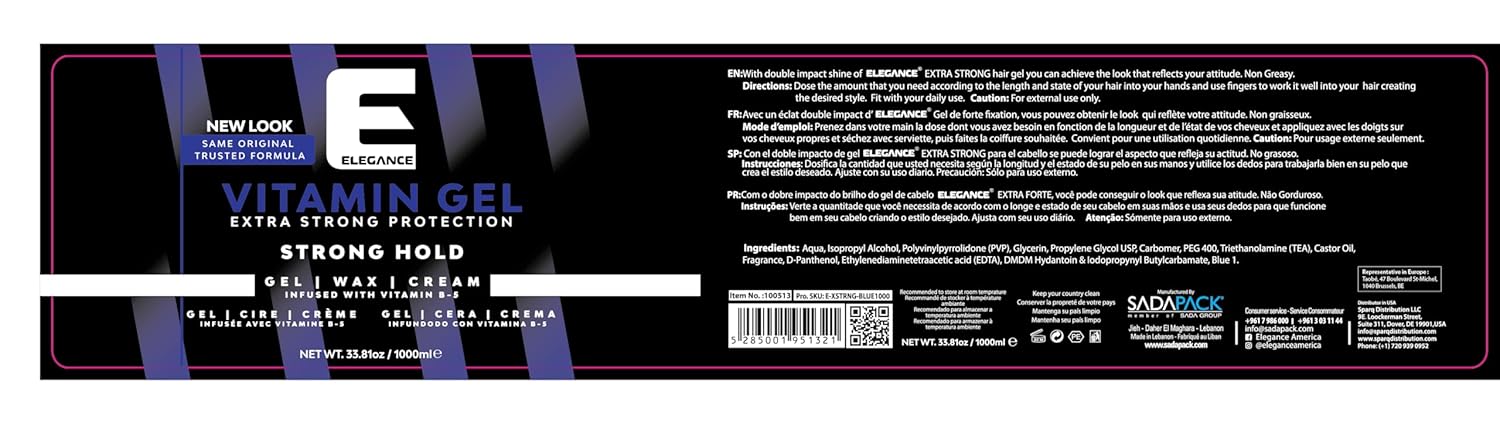 Elegance Vitamin Gel, 33.8 Oz, Infused with Vitamin Pro-VB-5, Strong Hold Gel, Maximum Hair Protection and Natural Long Lasting Shine