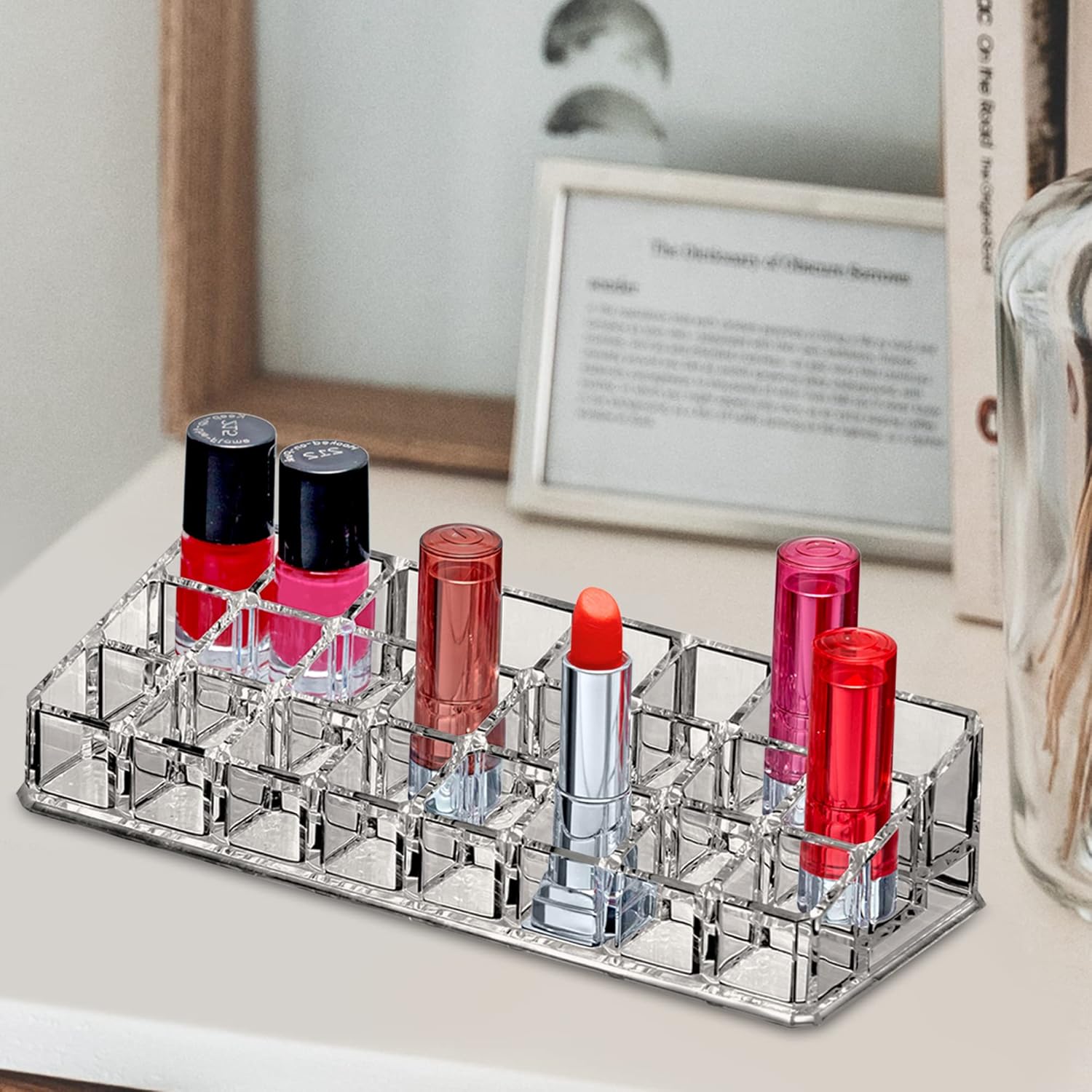 - [GREAT STORAGE] Acrylic cosmetic organizer for storing beauty products: lipsticks, lip glosses, eyeliners, and more. Perfect solution for organizing items and keeping the vanity neat and clean.