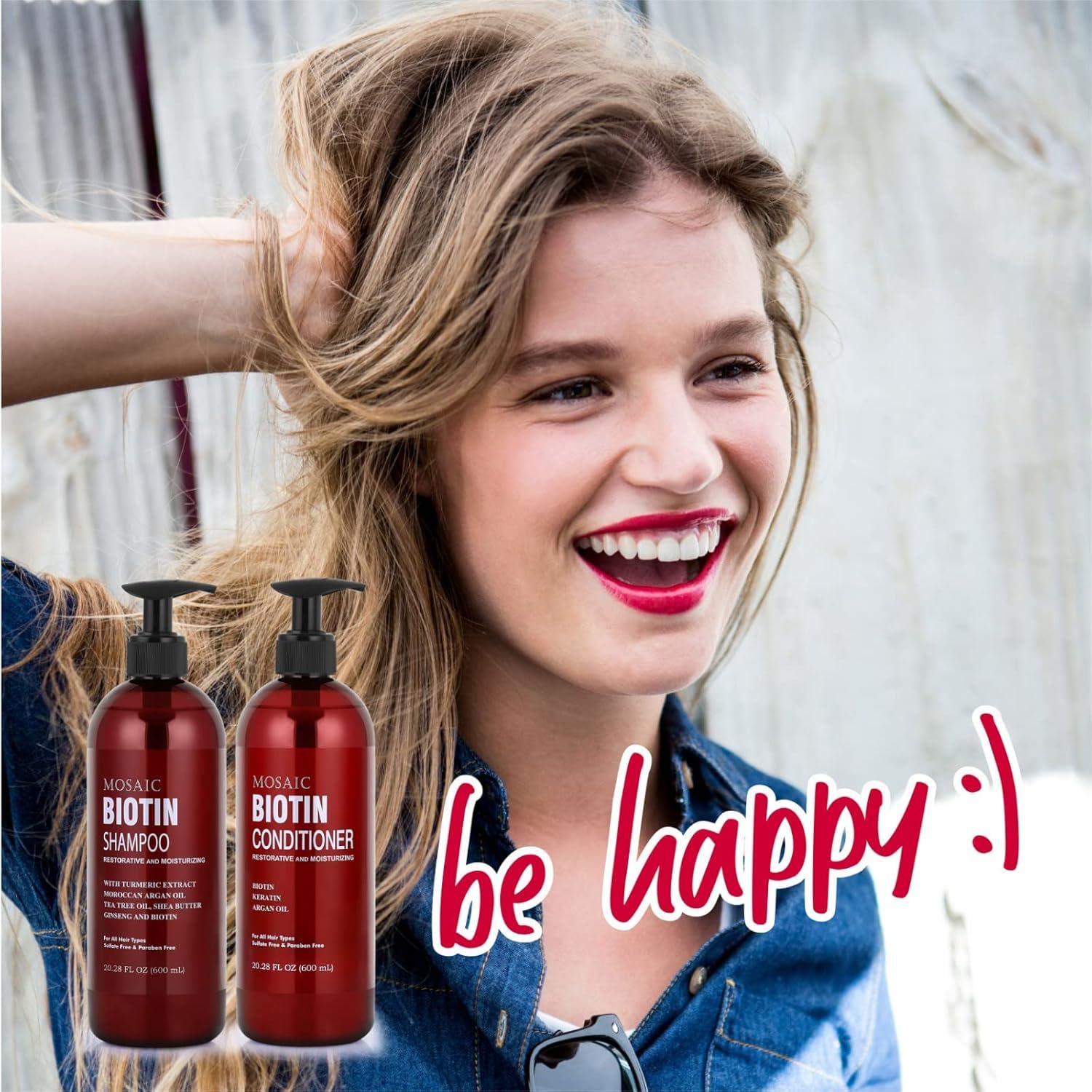 - ALL NATURAL SHAMPOO AND CONDITIONER – Mosaic Biotin restorative and moisturizing shampoo and conditioner set is infused with 100% Moroccan Argan Oil, Tea Tree Oil, Shea Butter, Keratin, Ginseng, Turmeric Extract, and Biotin (Vitamin H).