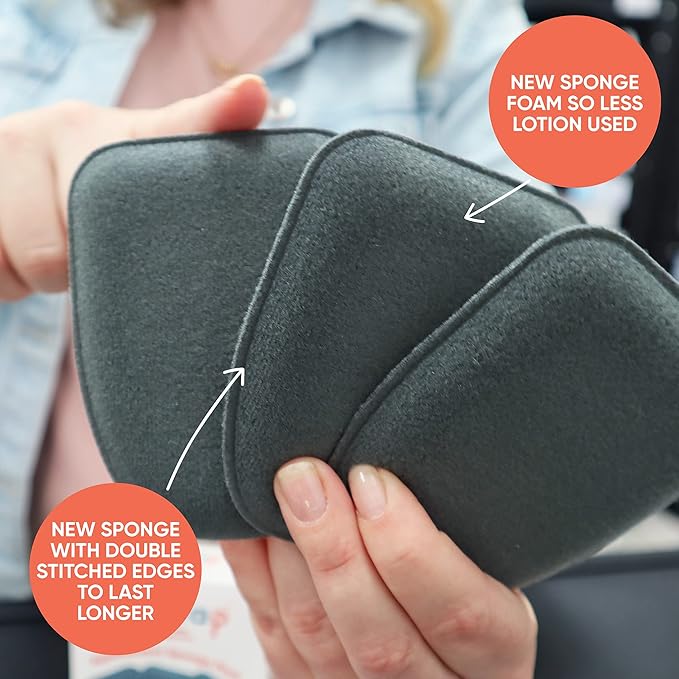 - IMPROVED REUSABLE & REPLACEABLE SPONGE PADS: New double-stitched edges for longer durability and less absorbent foam for efficient lotion use. Easily replaced when worn by simply peeling off from the Velcro.