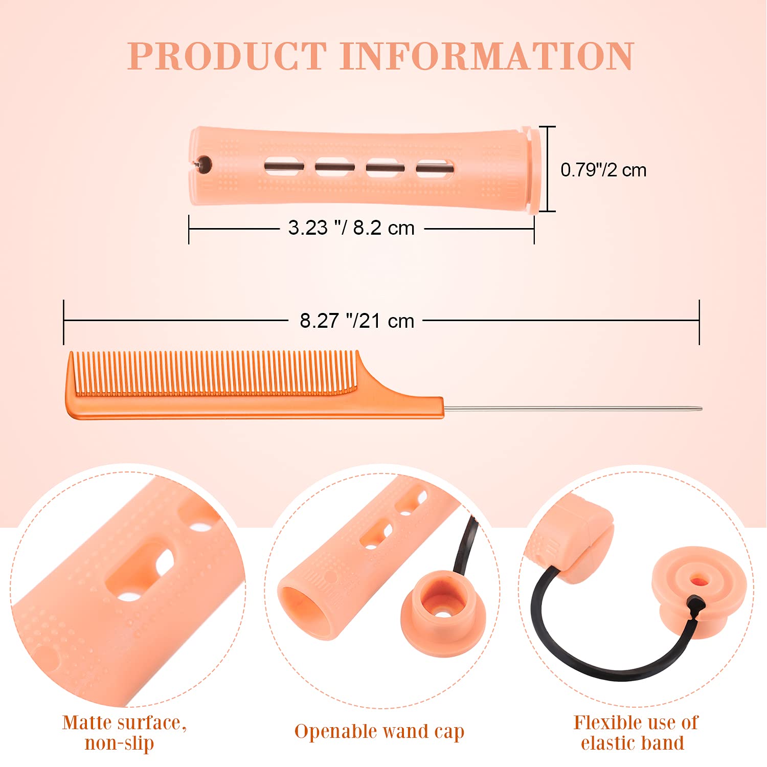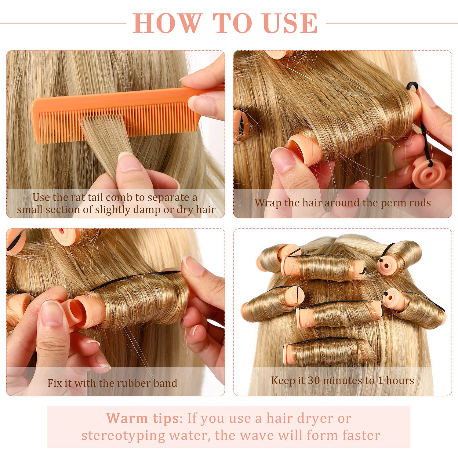 - Simple to apply: just use the rat tail comb to separate a small handful of slightly damp or dry hair, and wrap it on the rods; Then use the rubber band to fix it, does not require heating, no harm to the hair; Just wait for a while, you can make a natural curling hairstyle, adjust the direction of starting roll hair in or out can create various hair wave