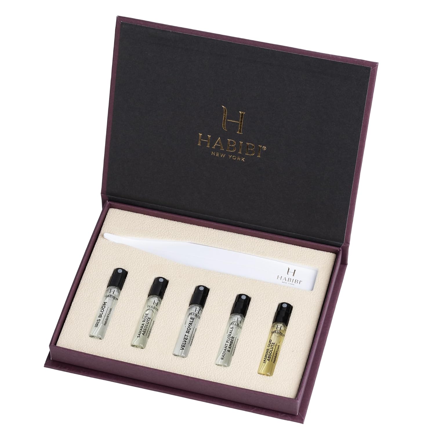 - LUXURY MINI PERFUME SET: The H Habibi Discovery Perfume Set comes with 5 X 2ml scents for you to fall in love with - Iris Bloom, Magnificent Magnolia, Velvet Royale, Sahara Rose Absolute, Rose Amor and Jasmine Oud Absolute